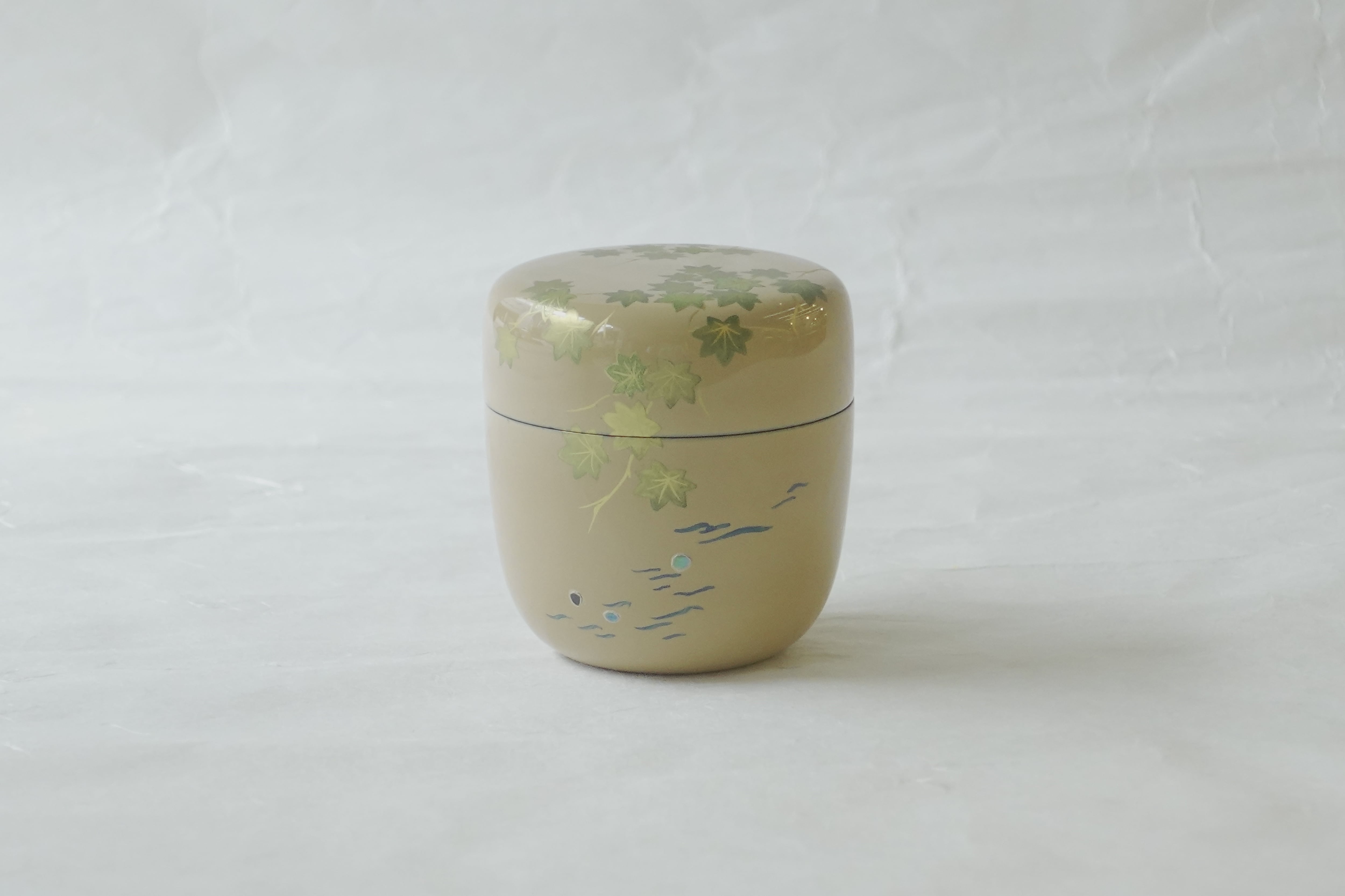 While tea caddies are typically finished in black lacquer, this piece features a striking white lacquer base, upon which fresh green maple leaves are elegantly depicted.