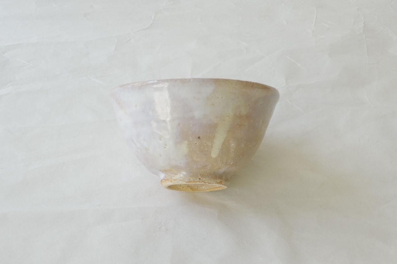 The clay used is coarse and rich in iron, giving it a faint reddish tone. Because the coarse clay is thrown quickly on the potter’s wheel, the wheel marks remain visible. The glaze is applied using the zubu-gake method, in which the entire bowl—inside and out, even the inside of the foot—is fully dipped in glaze, leaving almost no exposed clay on the foot.