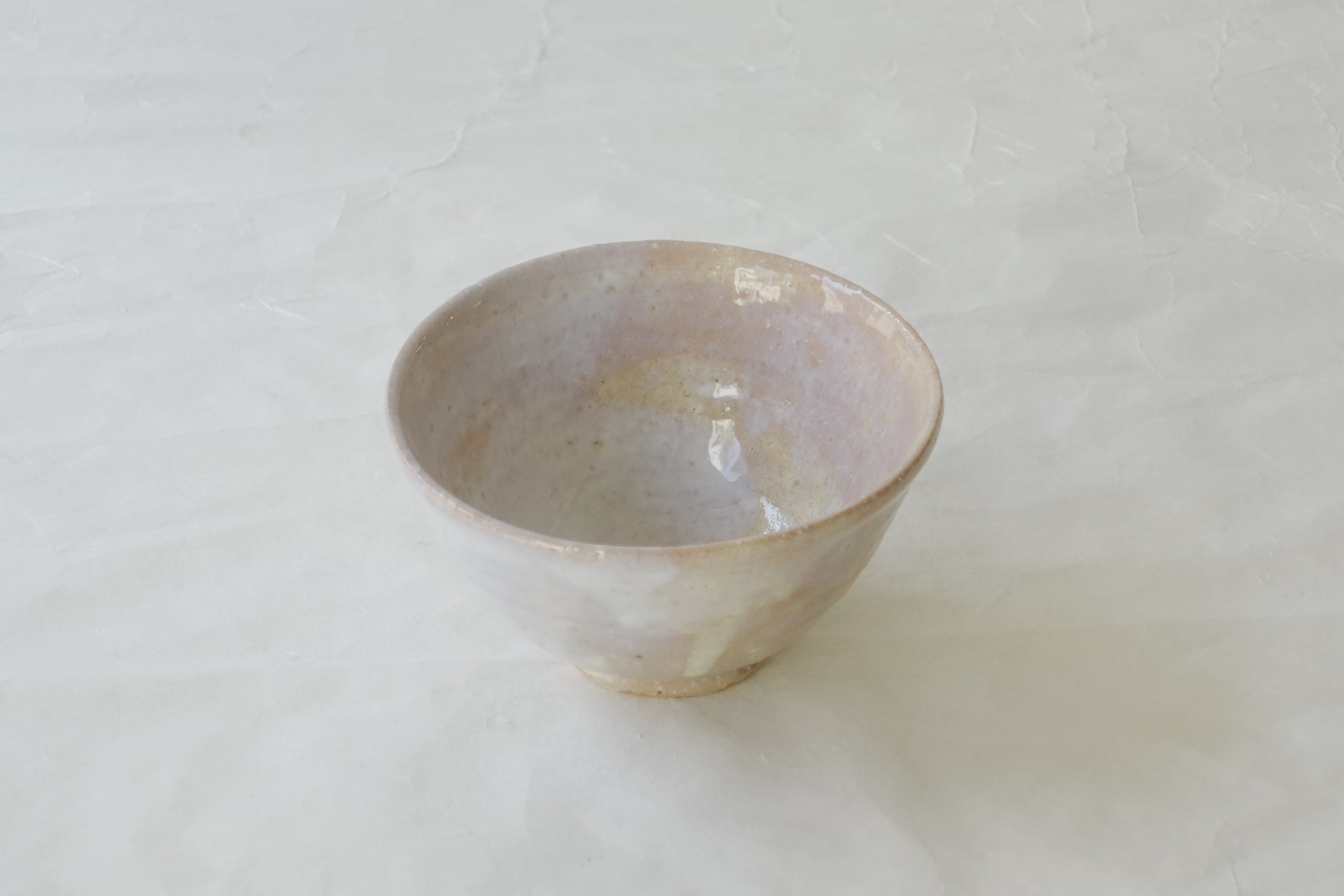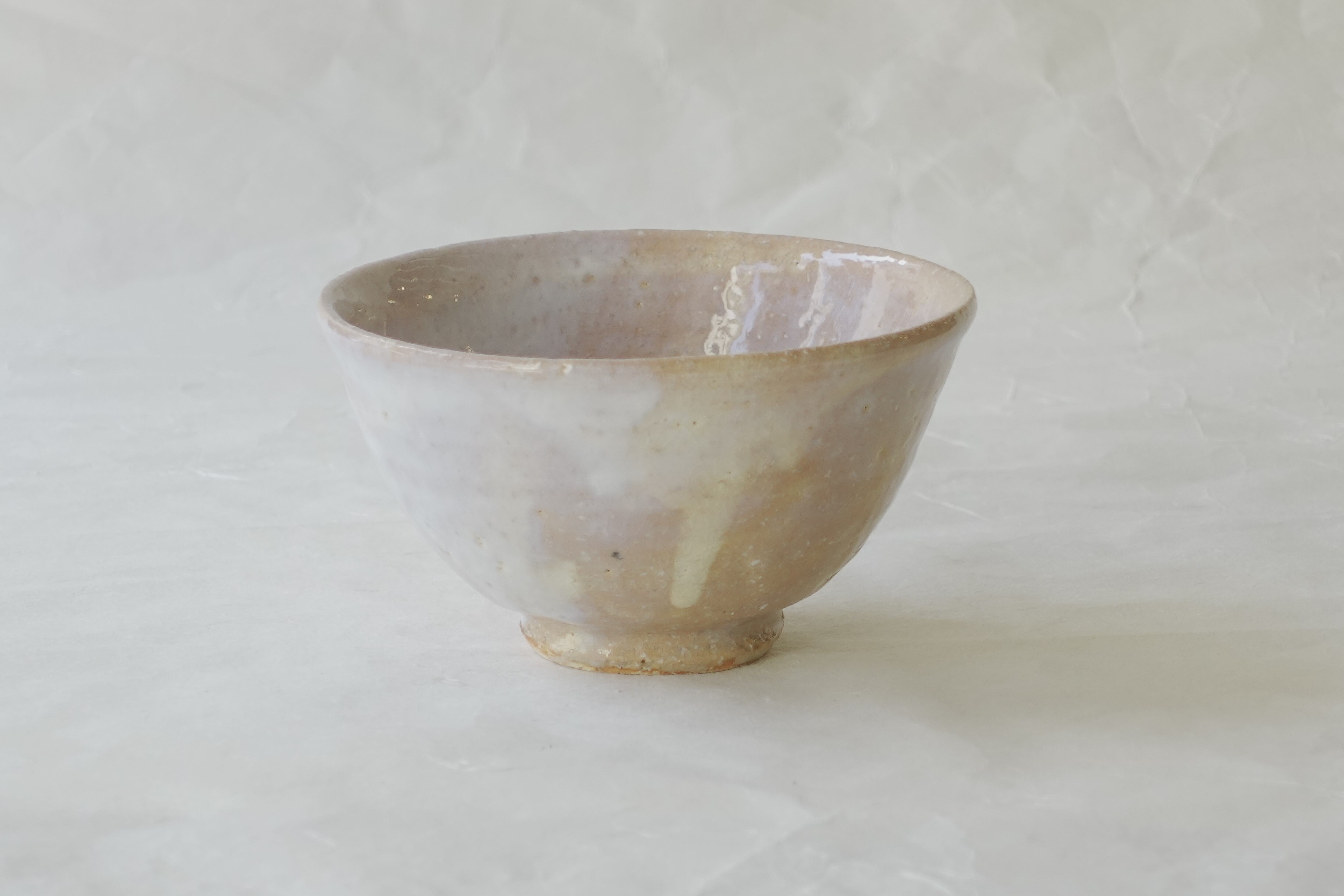 Compared to O-ido bowls, this piece is smaller with a lower foot, a style known as Ko-ido, typically used for serving usucha (thin tea). The reddish clay body is covered with a white glaze, which has undergone yohen (kiln changes) during firing, creating complex variations in the glaze surface.
