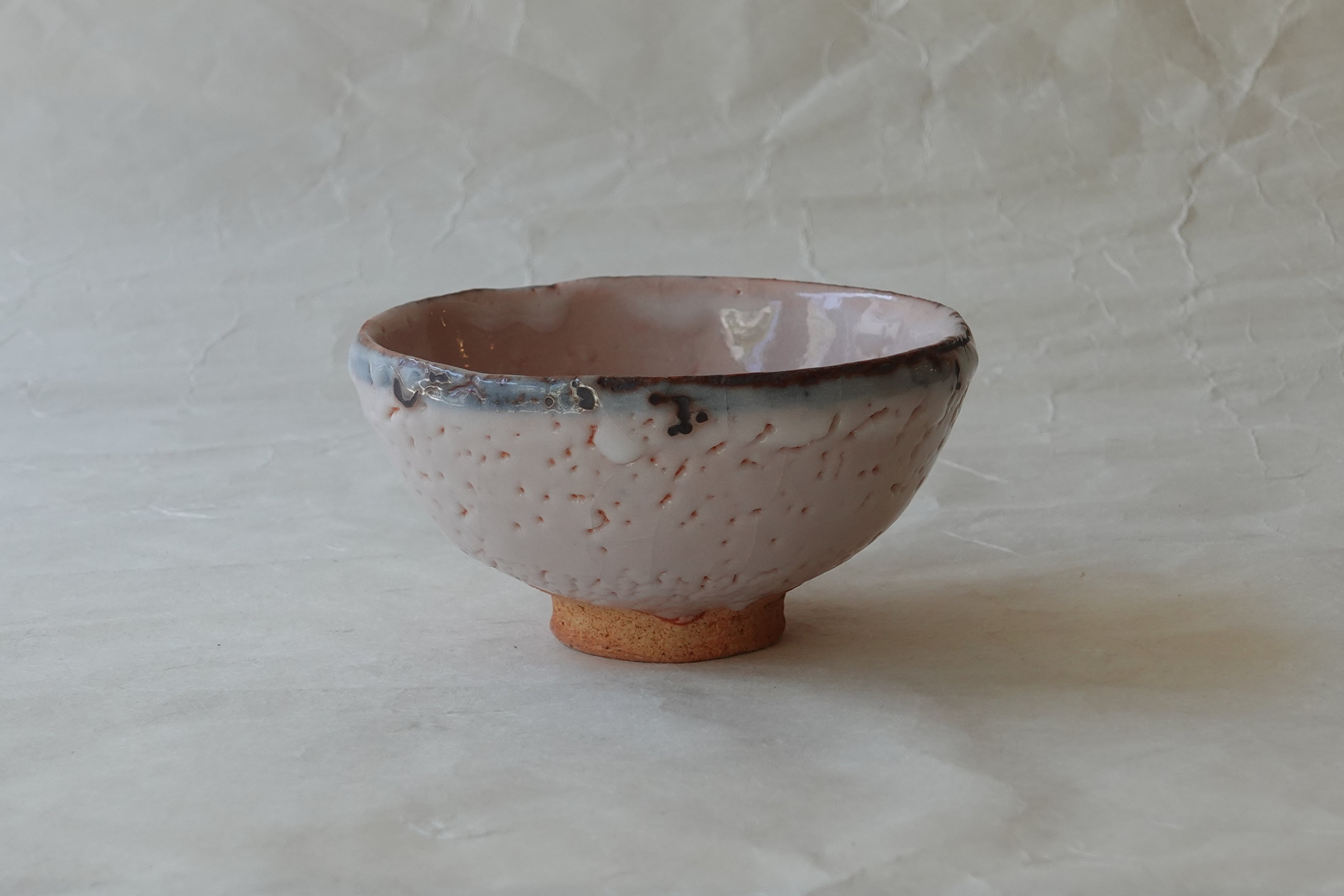 This rice bowl is called Beni-Shino (Red Shino), characterized by a soft pinkish hue, presenting a remarkably beautiful coloration. The surface shows natural crackling in the glaze and countless pinholes, with some areas revealing the underlying clay, creating a powerful, expressive texture.