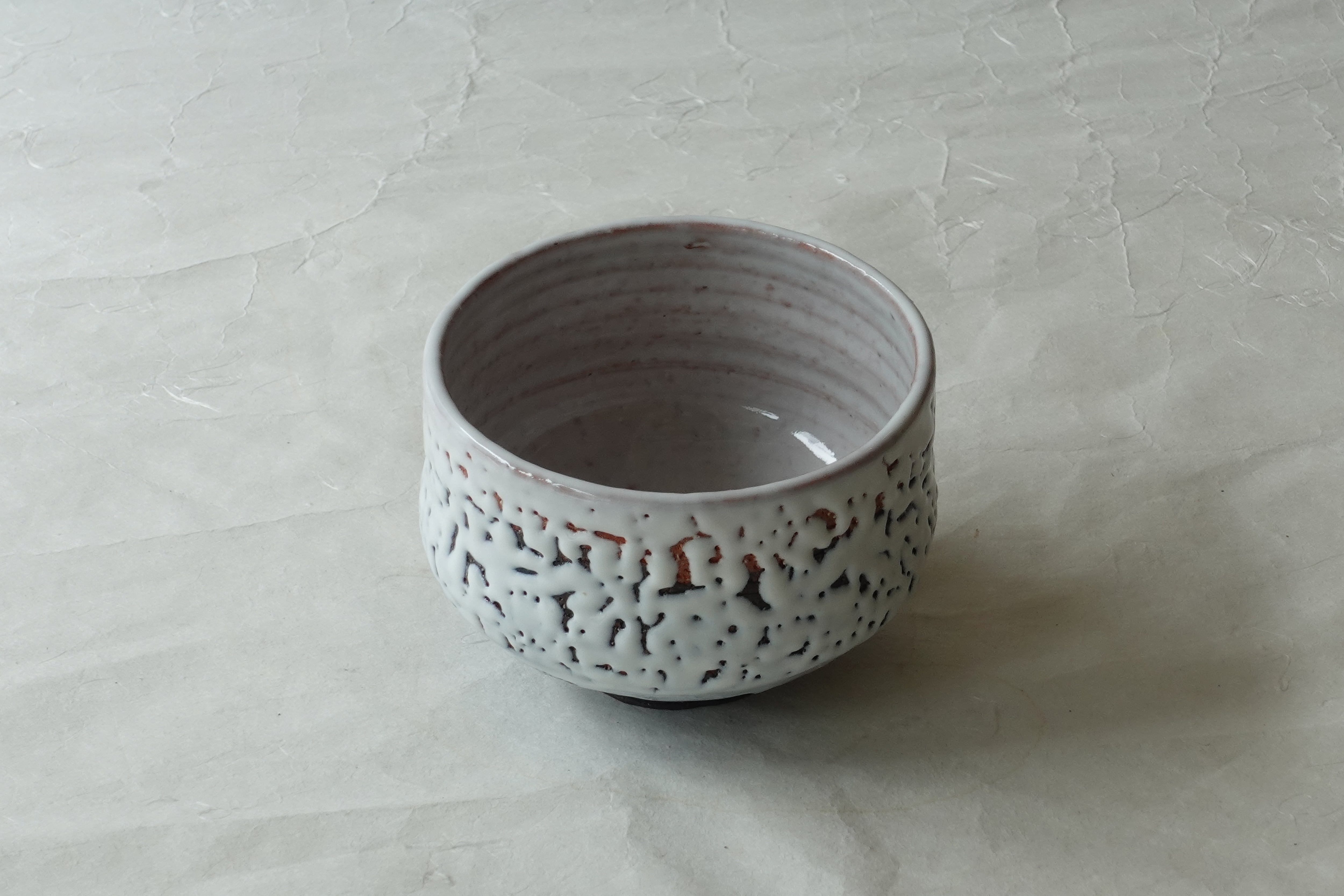 此碗以夹杂小石的黑色陶土拉坯成形,施以白釉烧制而成,被称为“白萩”。