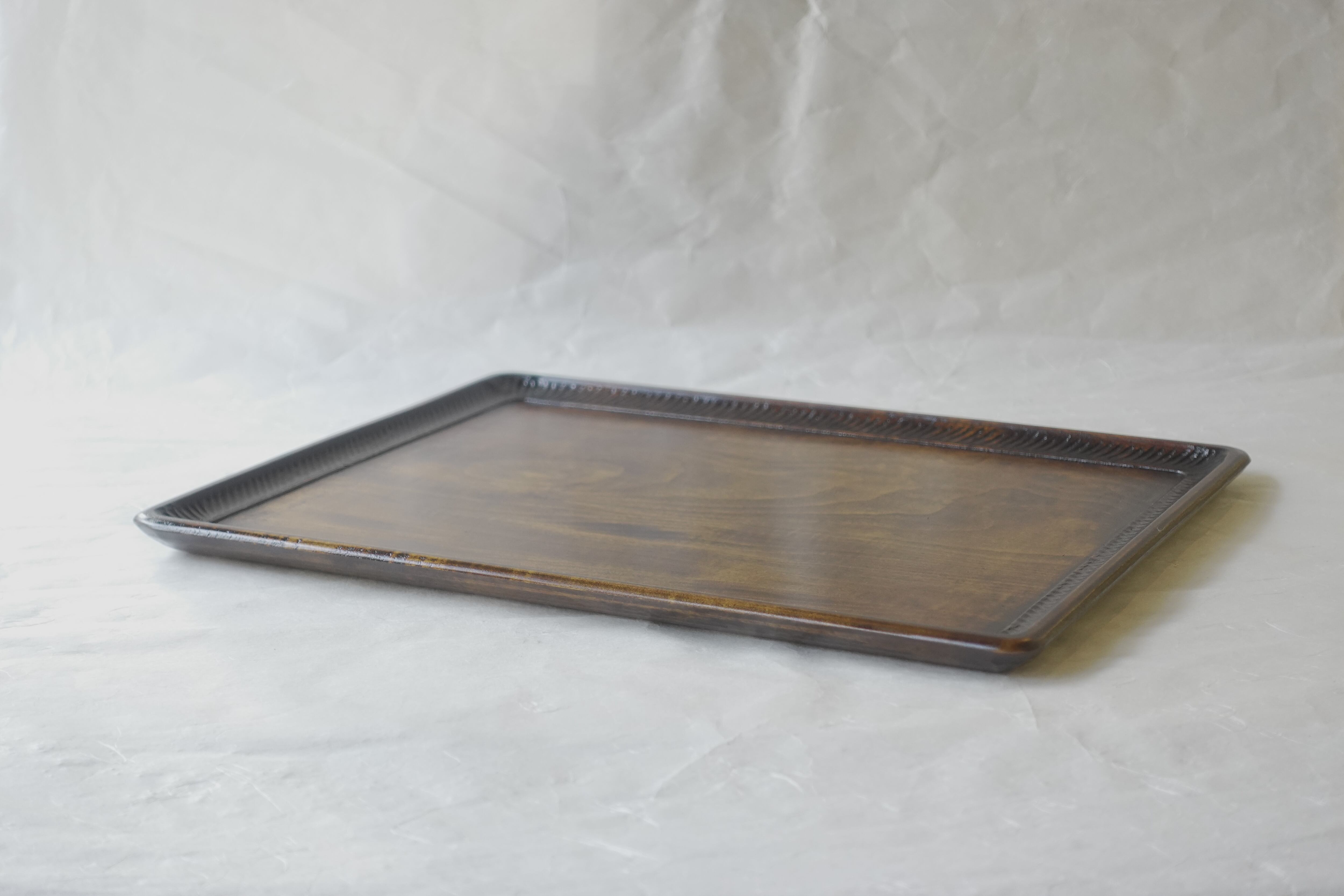 The rim of the tray features a diagonal carved pattern, but the surface where dishes are placed is finished flat without chisel-carving techniques, resulting in a simple, clean finish.