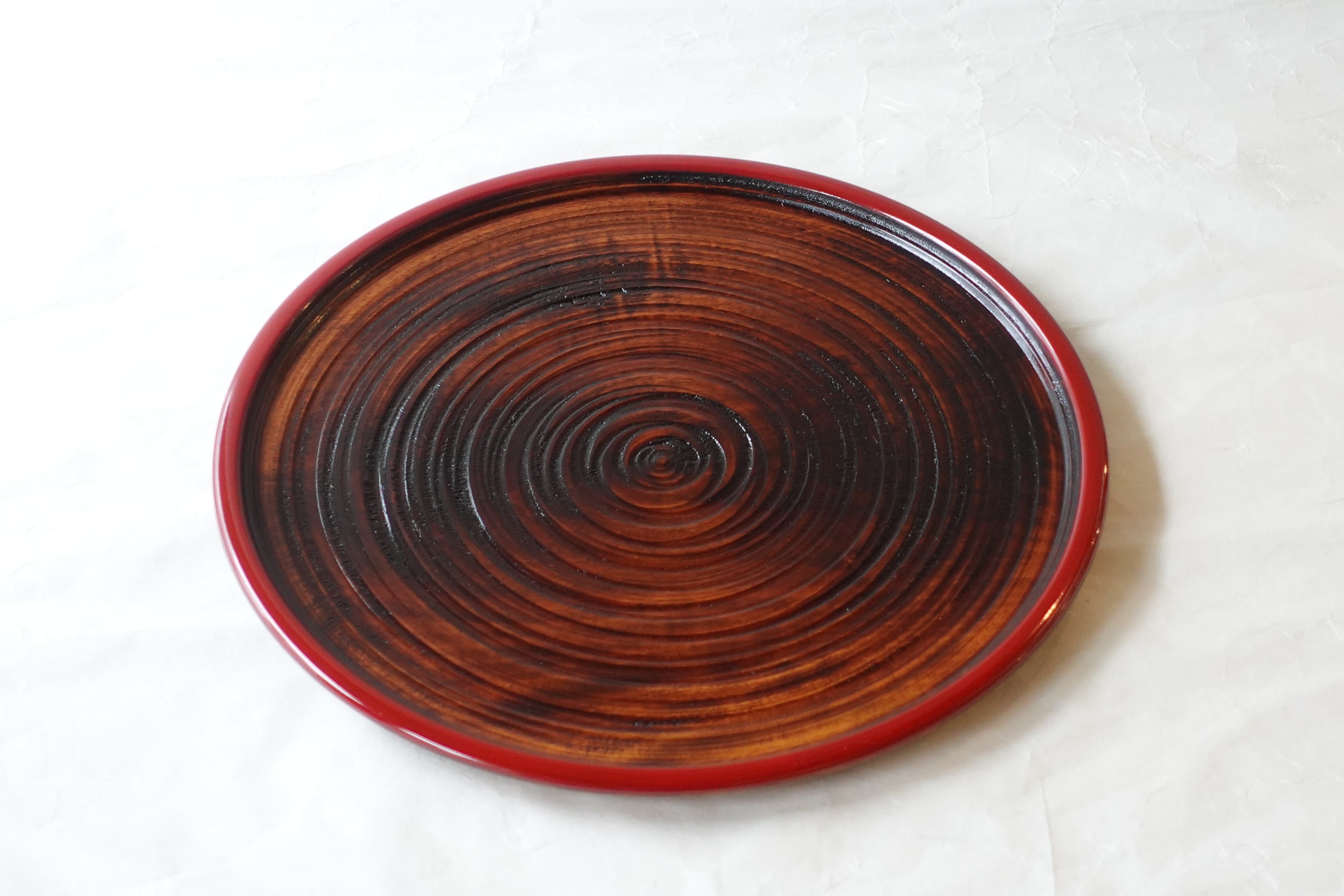 The center of the front surface is finished with a suri-urushi (wiped lacquer) technique, allowing the natural color of the wood to remain visible and conveying the warmth and beauty unique to wood. The rim is accented with vermilion lacquer, adding a bright and elegant touch.