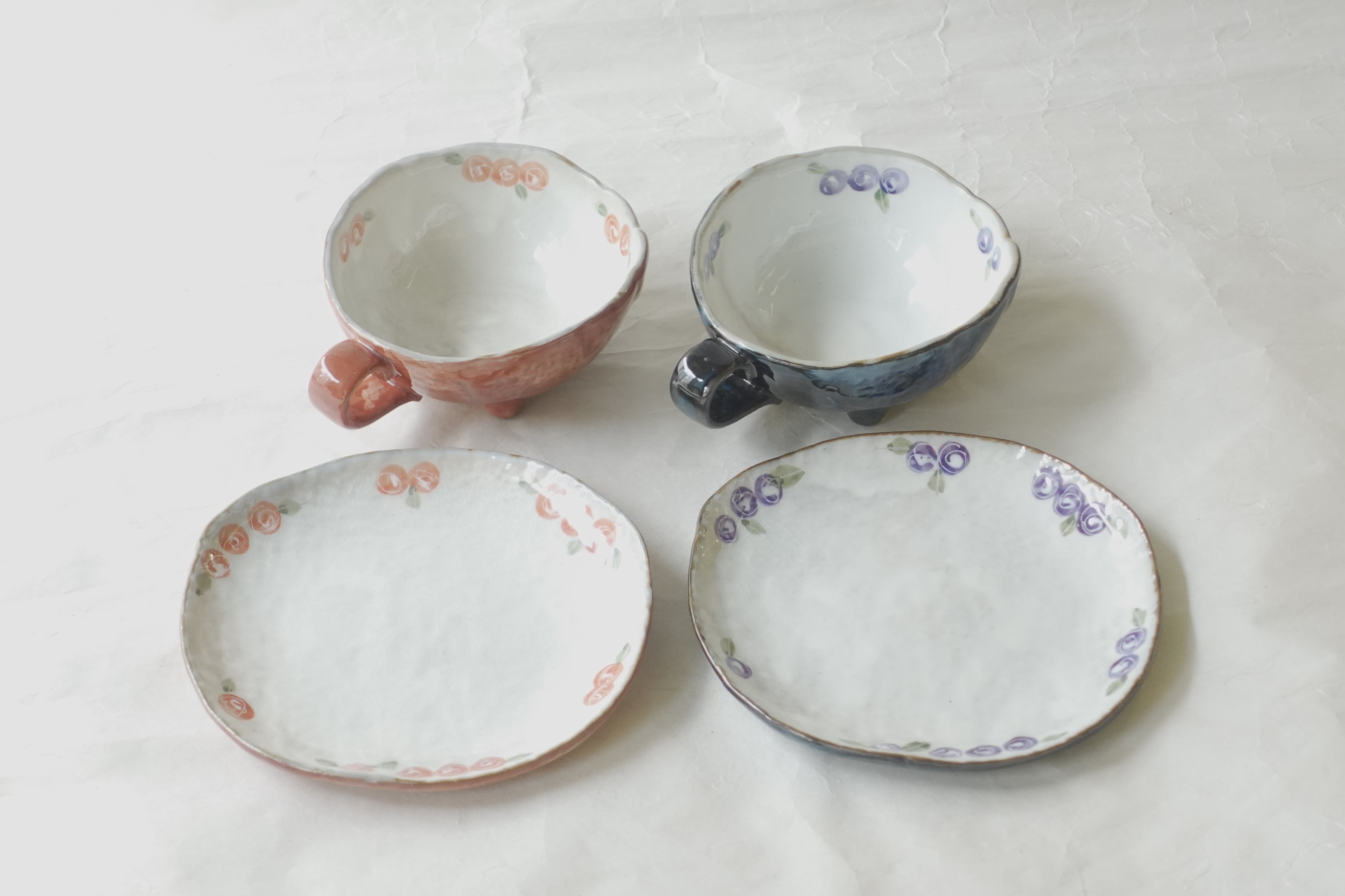 Akazu Ware – Pair of Coffee Cups and Saucers with Polychrome Glaze and Hand-Painted Roses