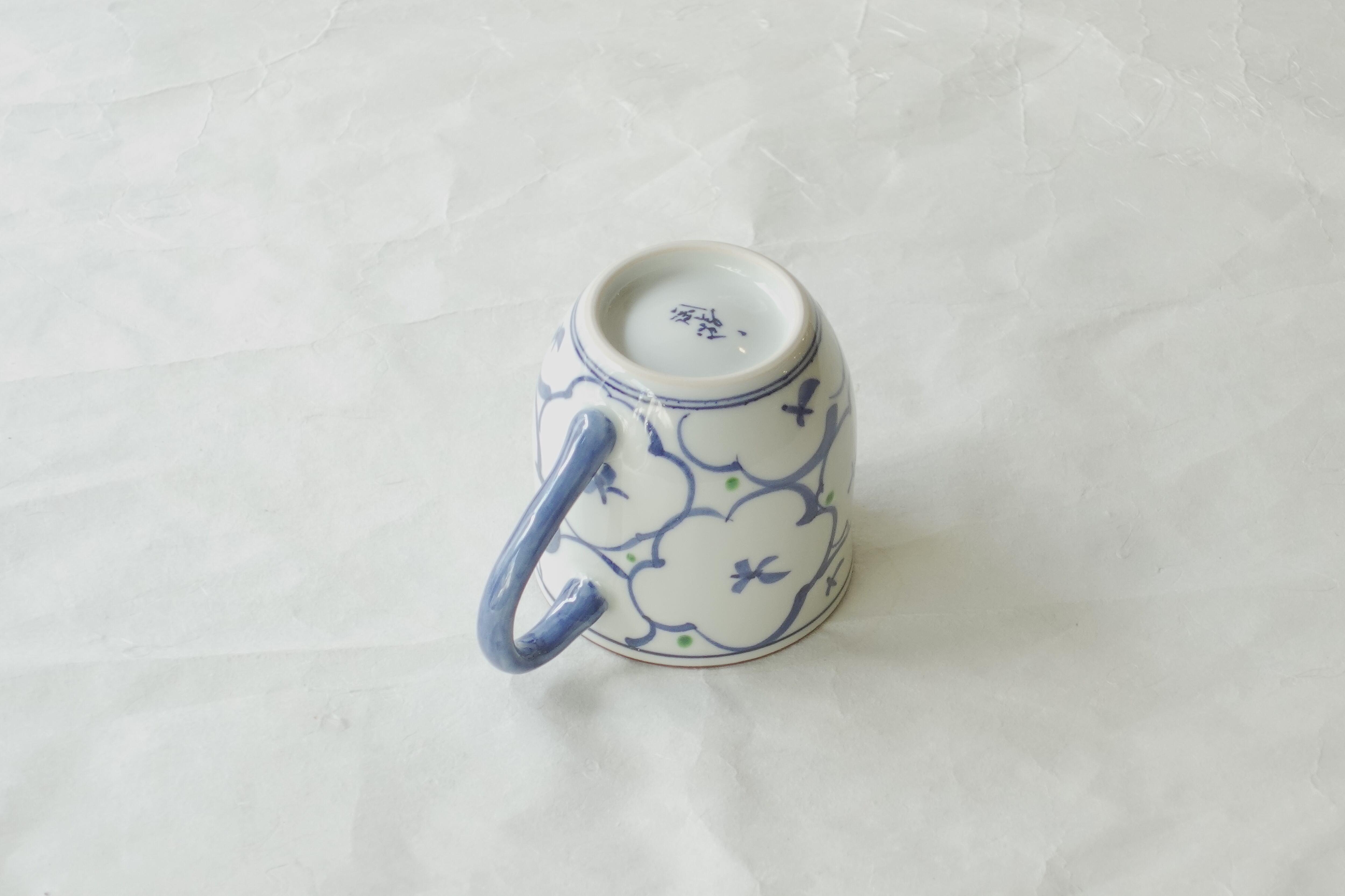 杯柄同样涂绘为蓝色,白地衬托花卉的青色,配以绿色的点状纹饰,呈现出雅致又时尚的设计。