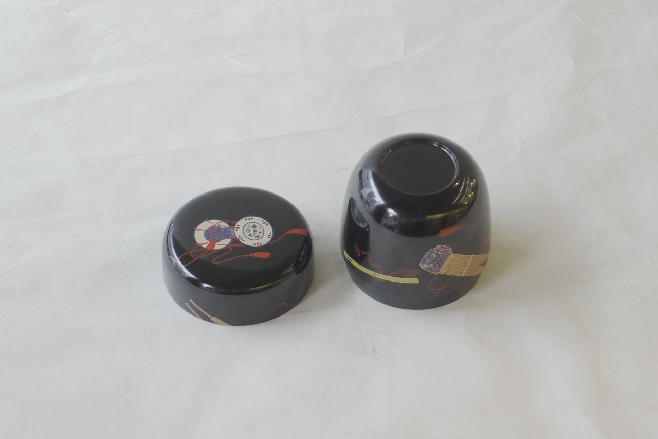 黒の真塗りの上に蓋には鼓(つづみ)、