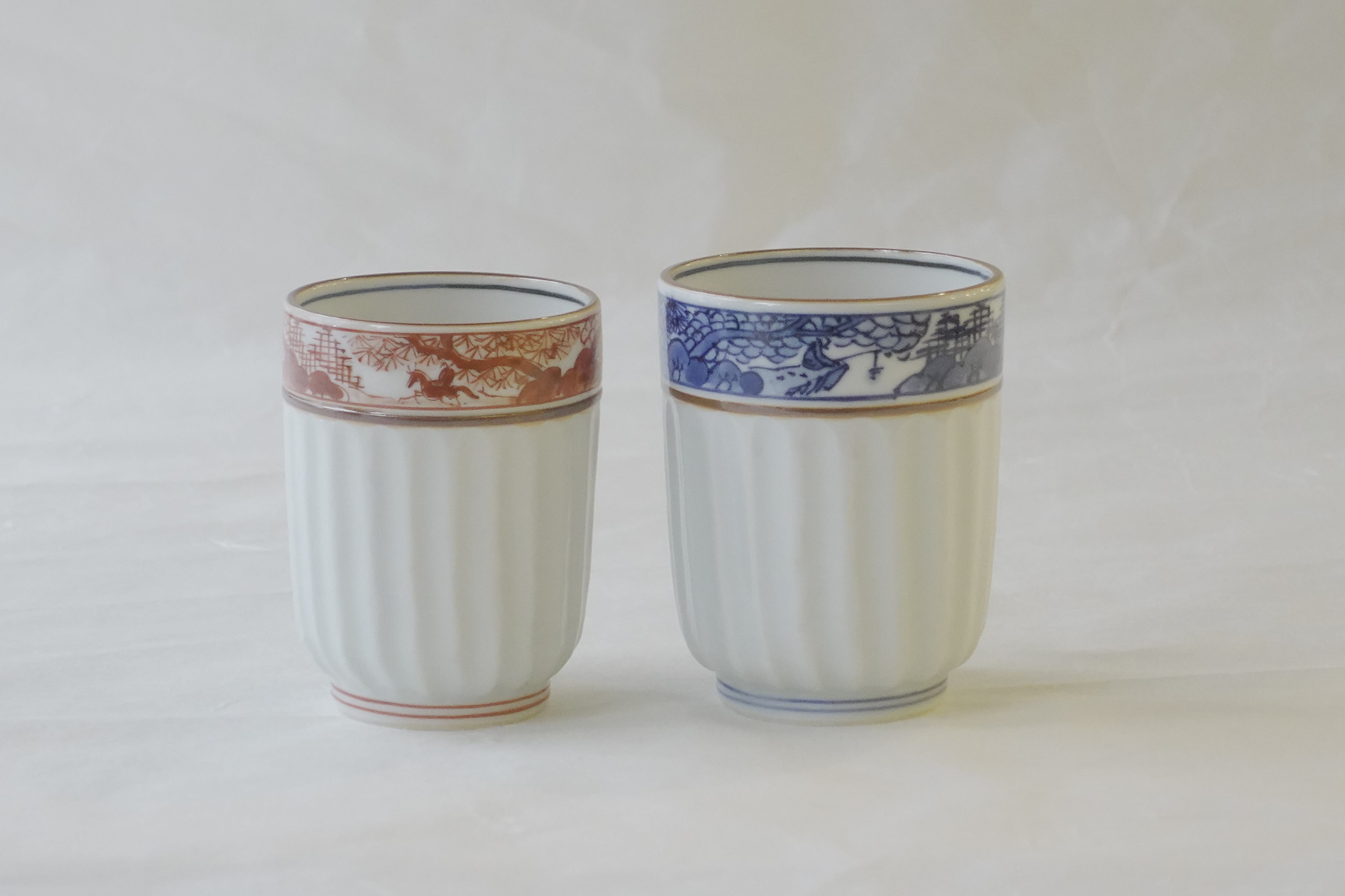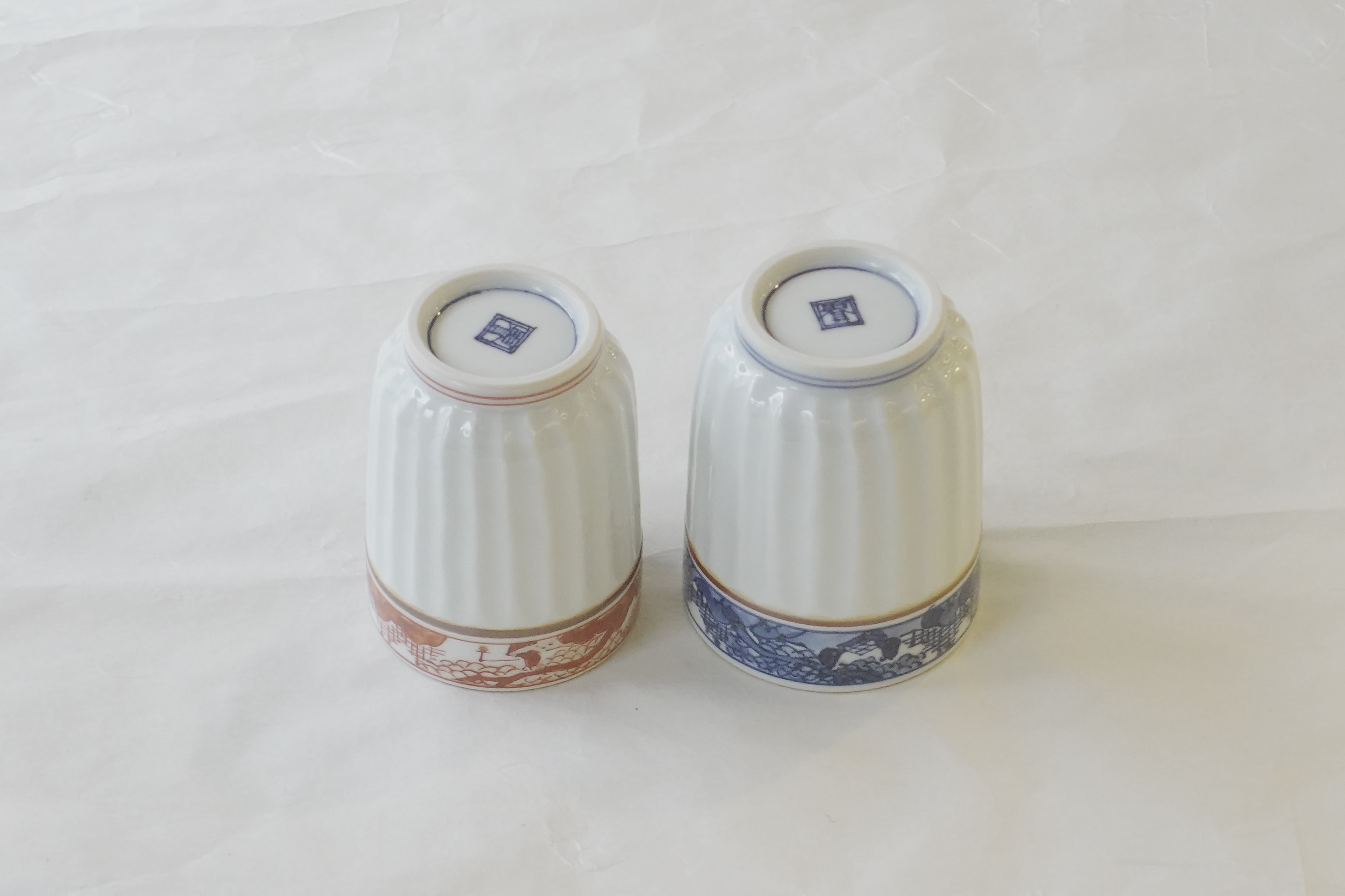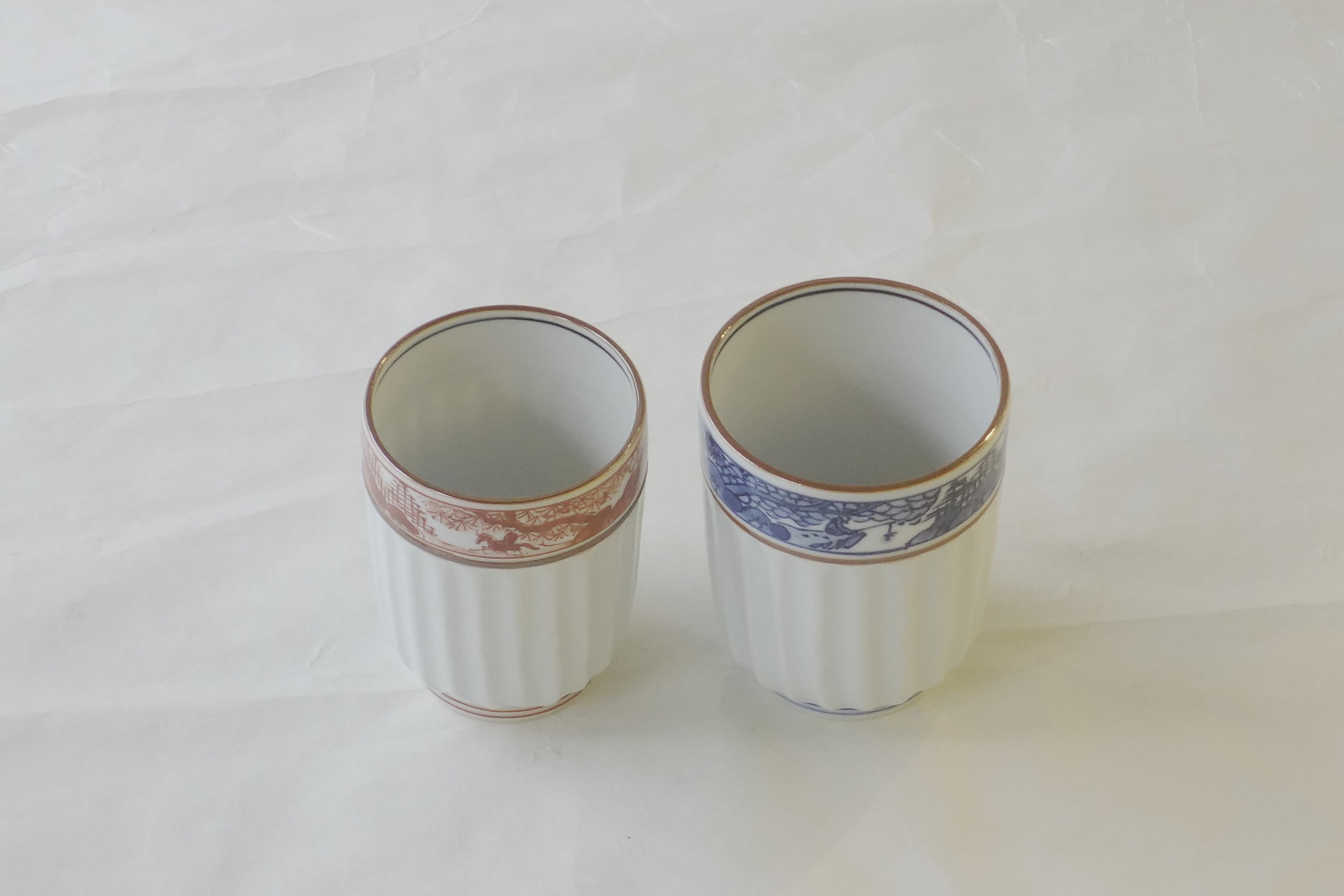 Although both cups feature the same design, the use of sometsuke and akae gives each a distinctly different atmosphere.