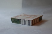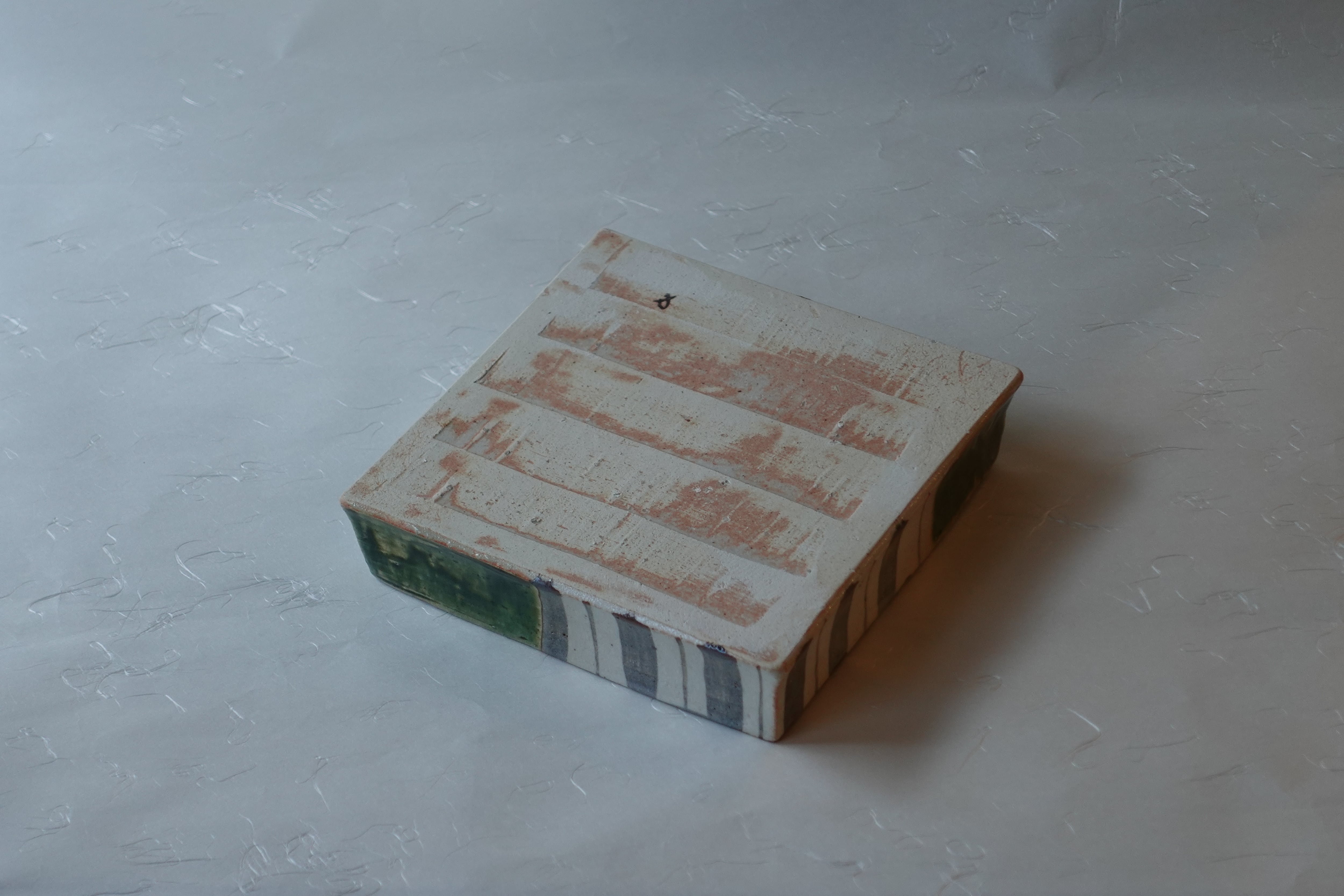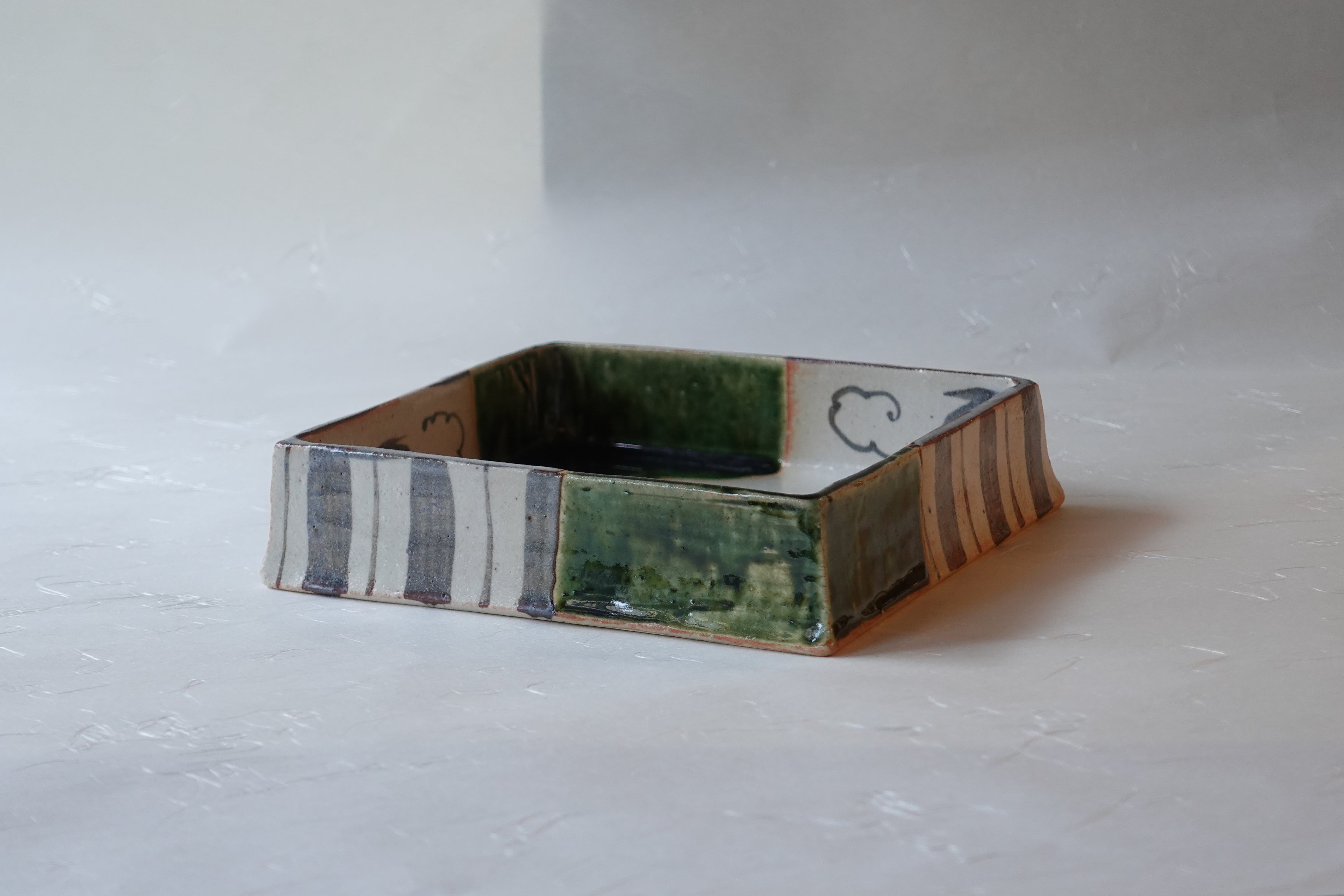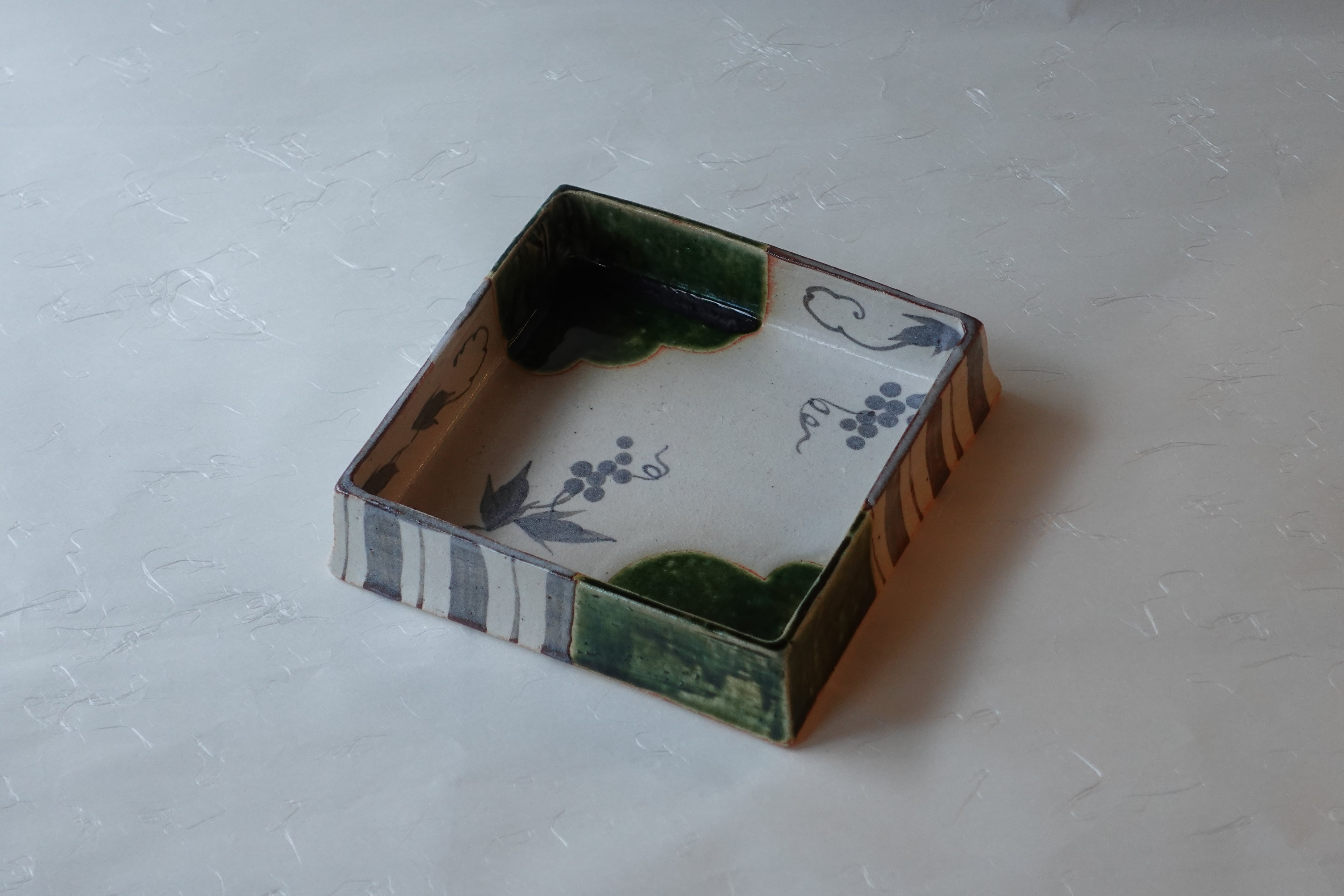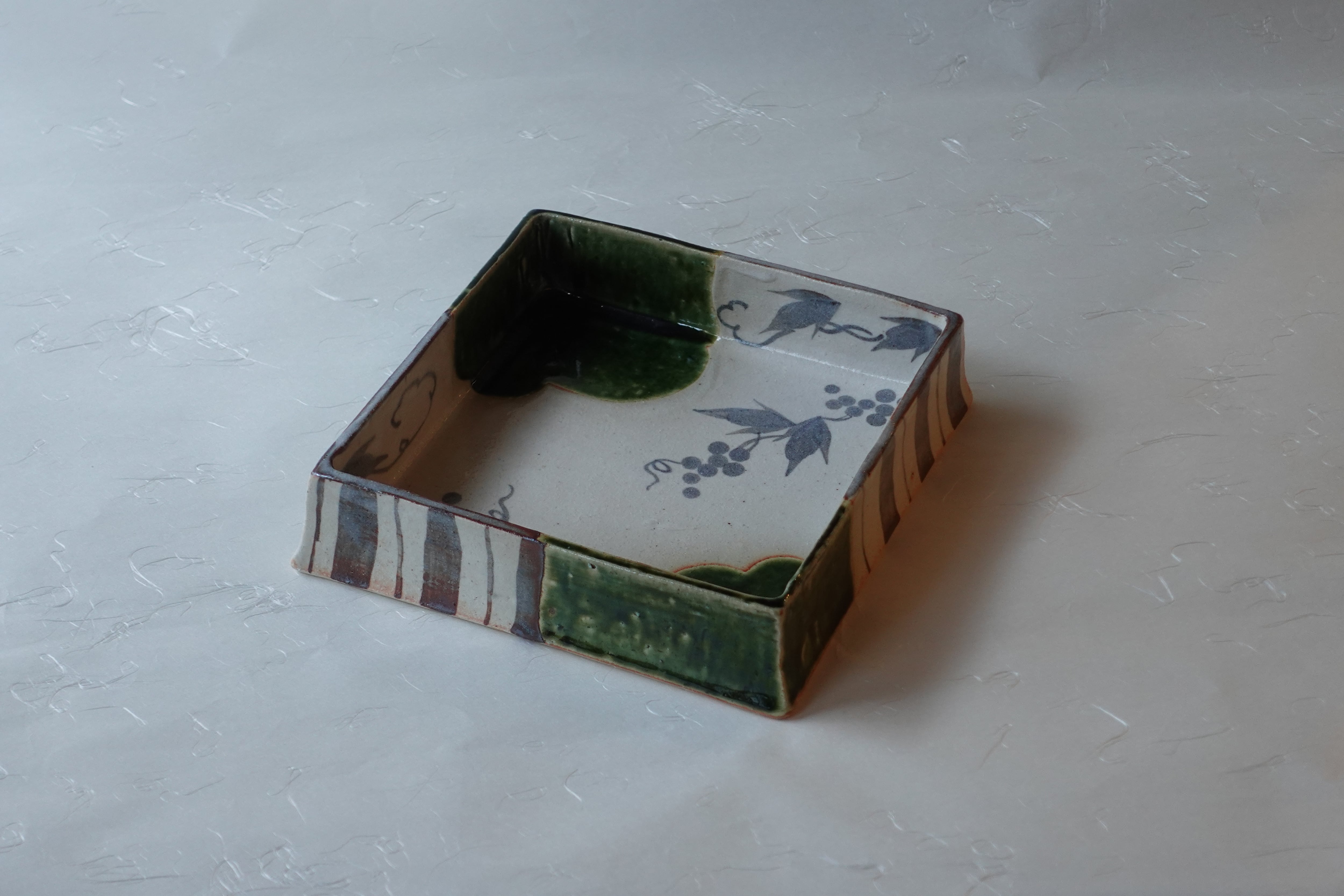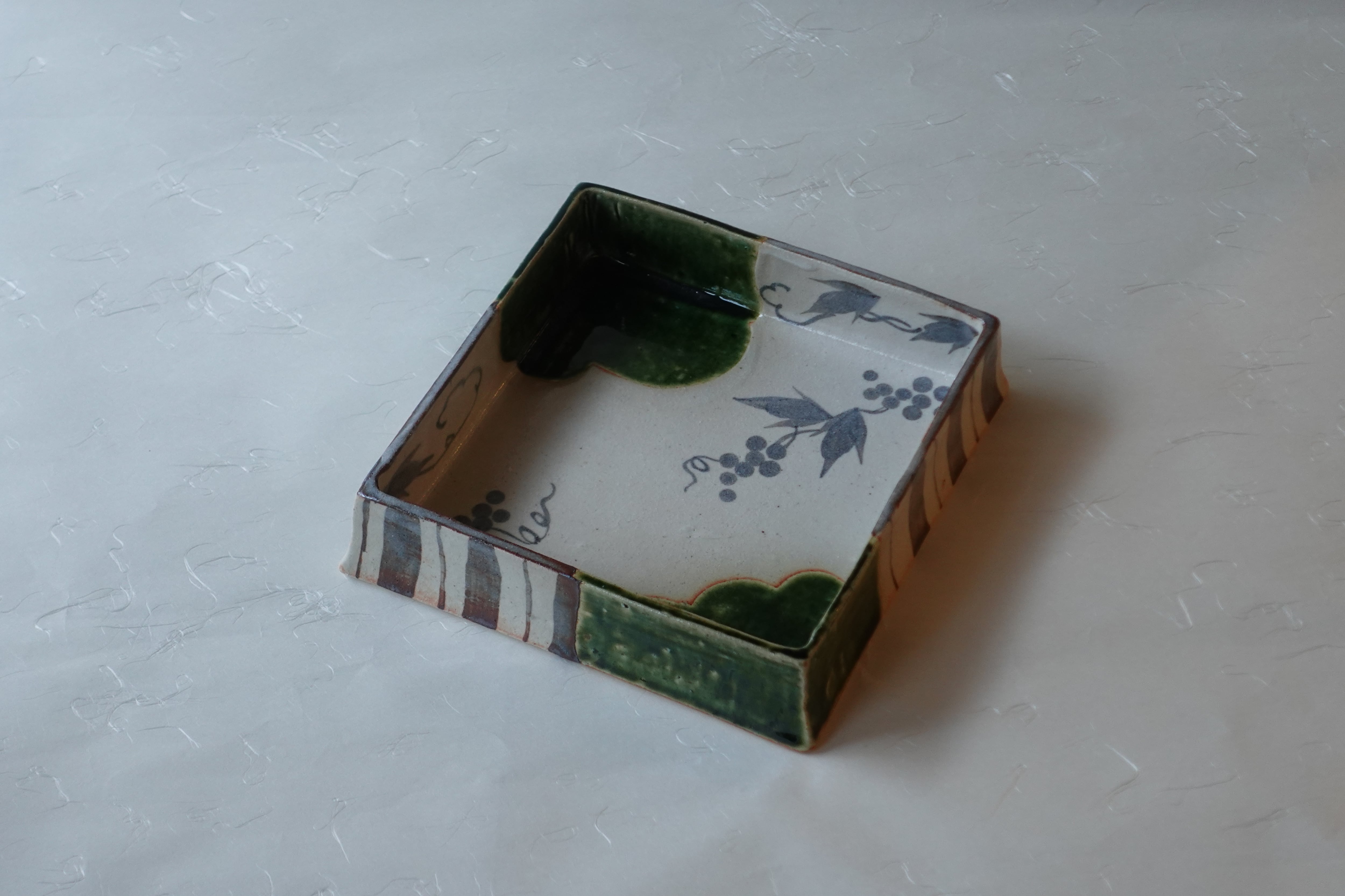 織部釉は隅の2か所に施釉され、ぶどう柄も