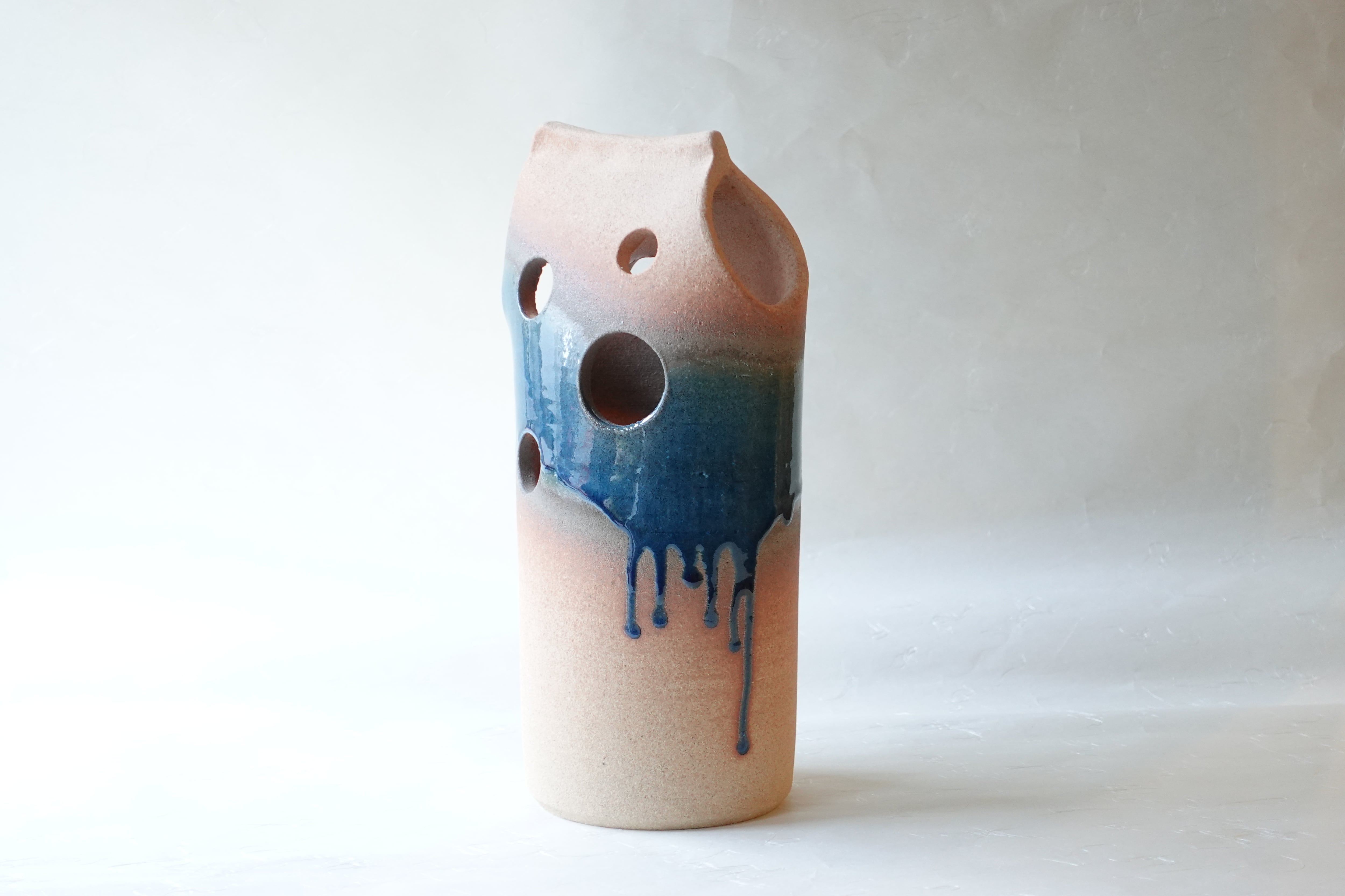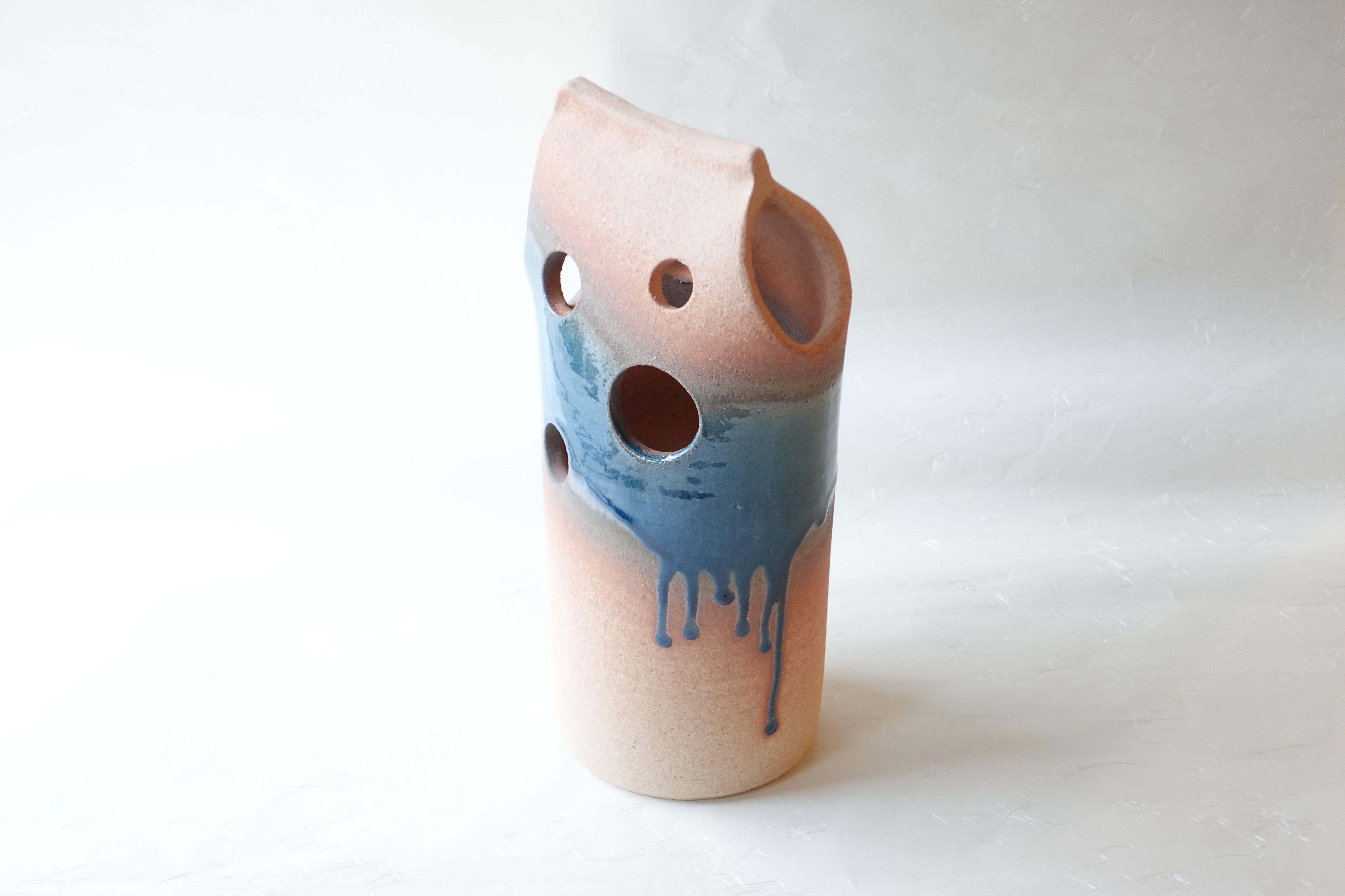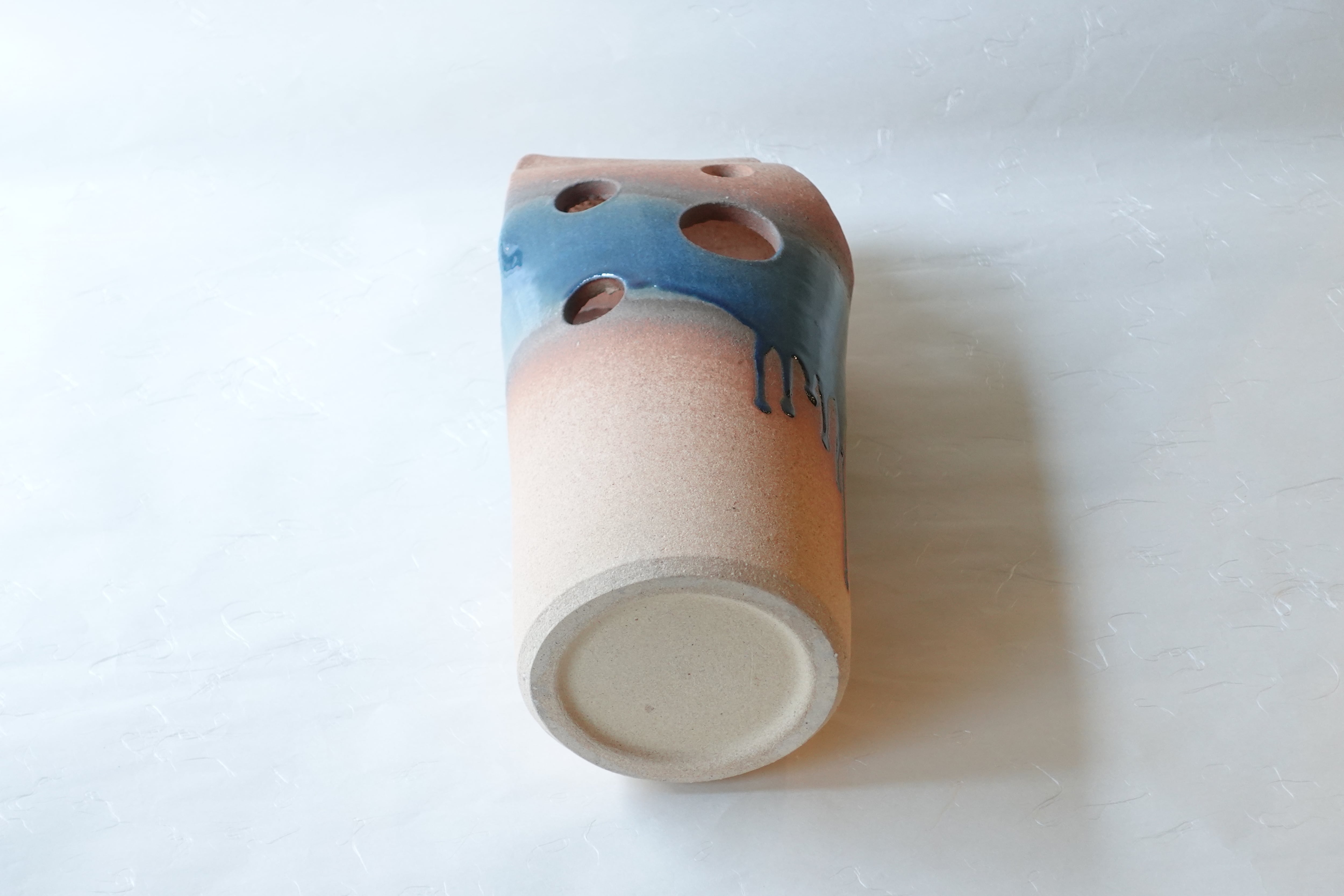 無釉の薄茶色に生地に青い釉薬が掛けられ、