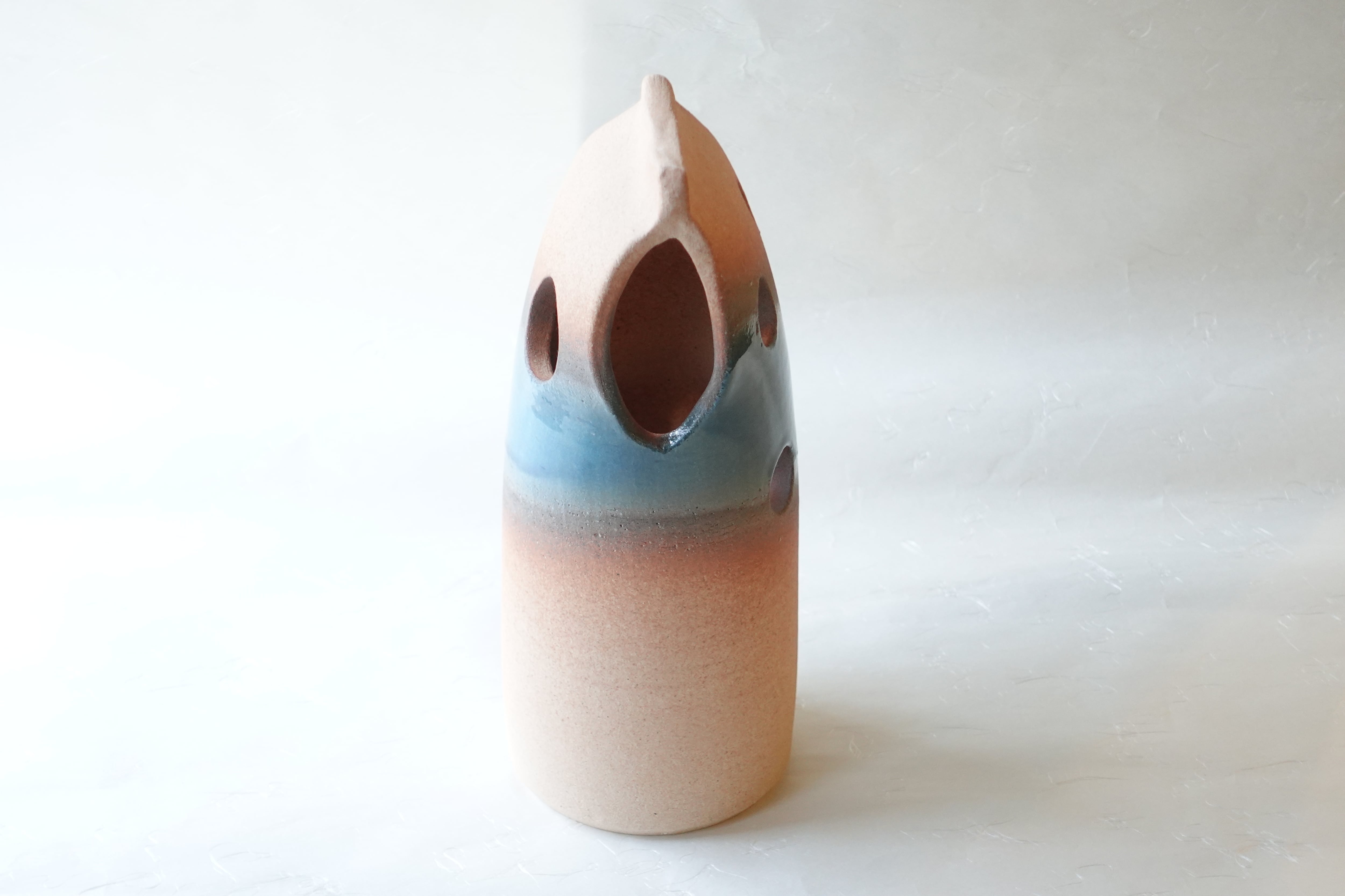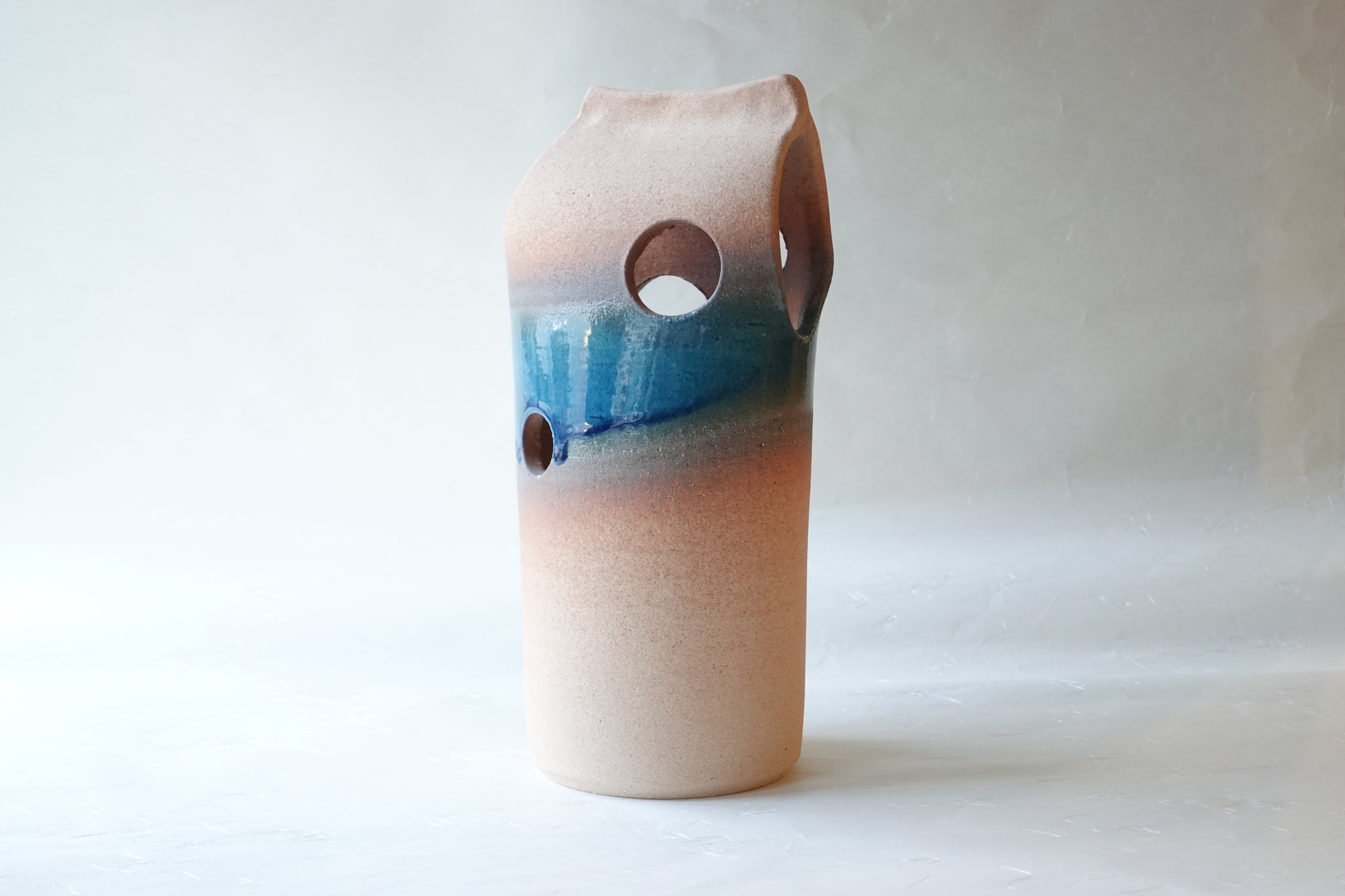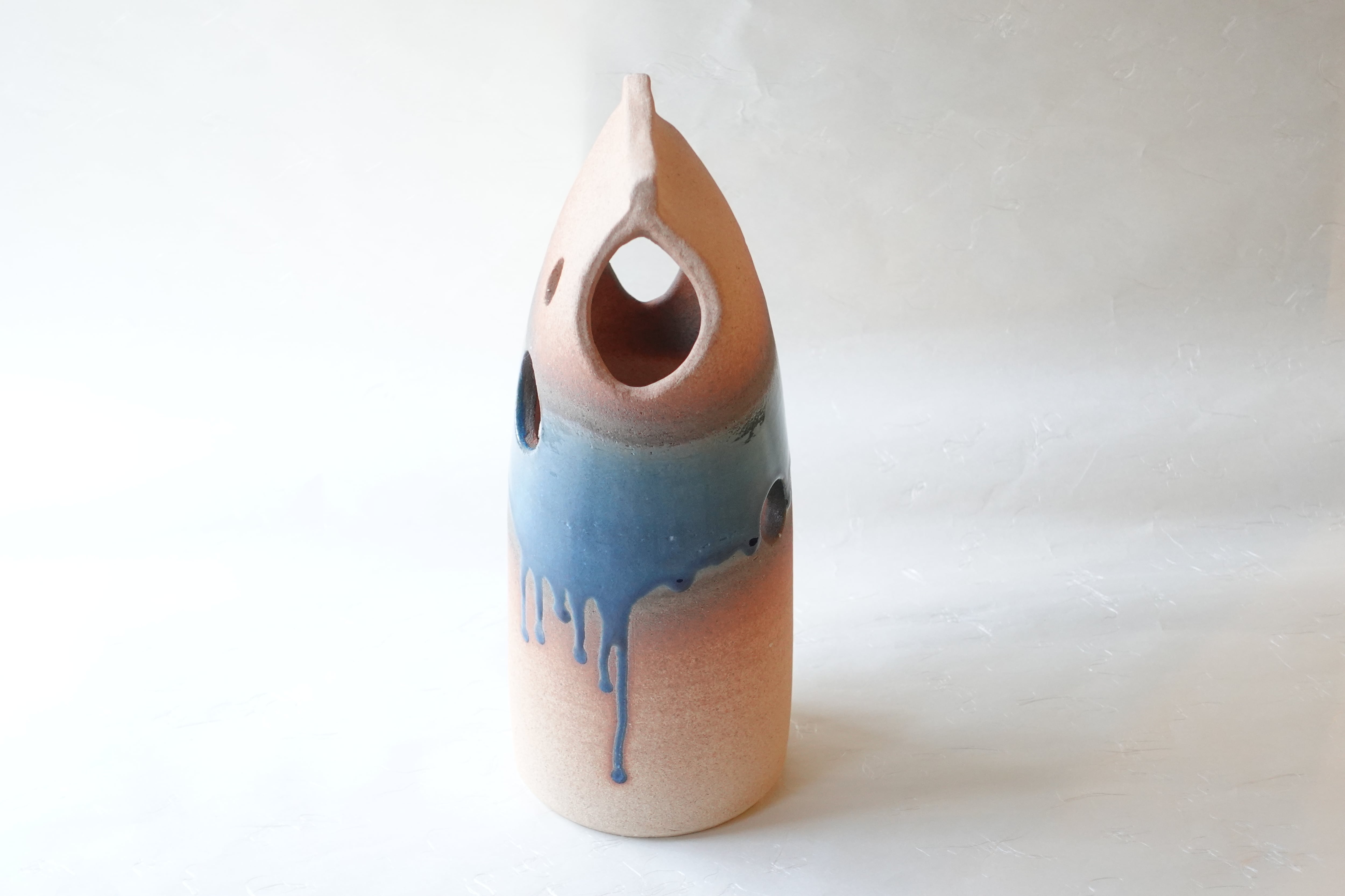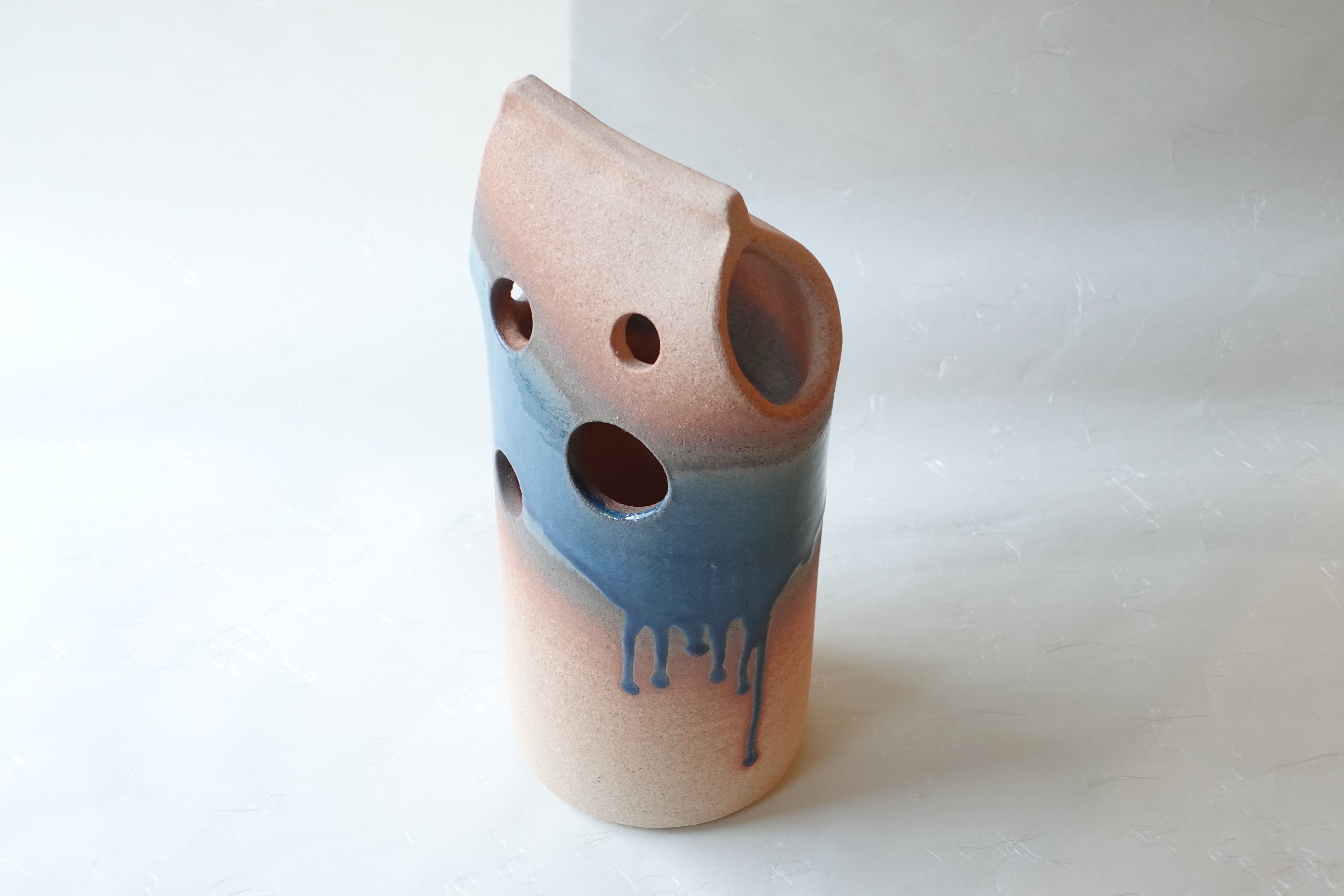 無釉の薄茶色に生地に青い釉薬が掛けられ、