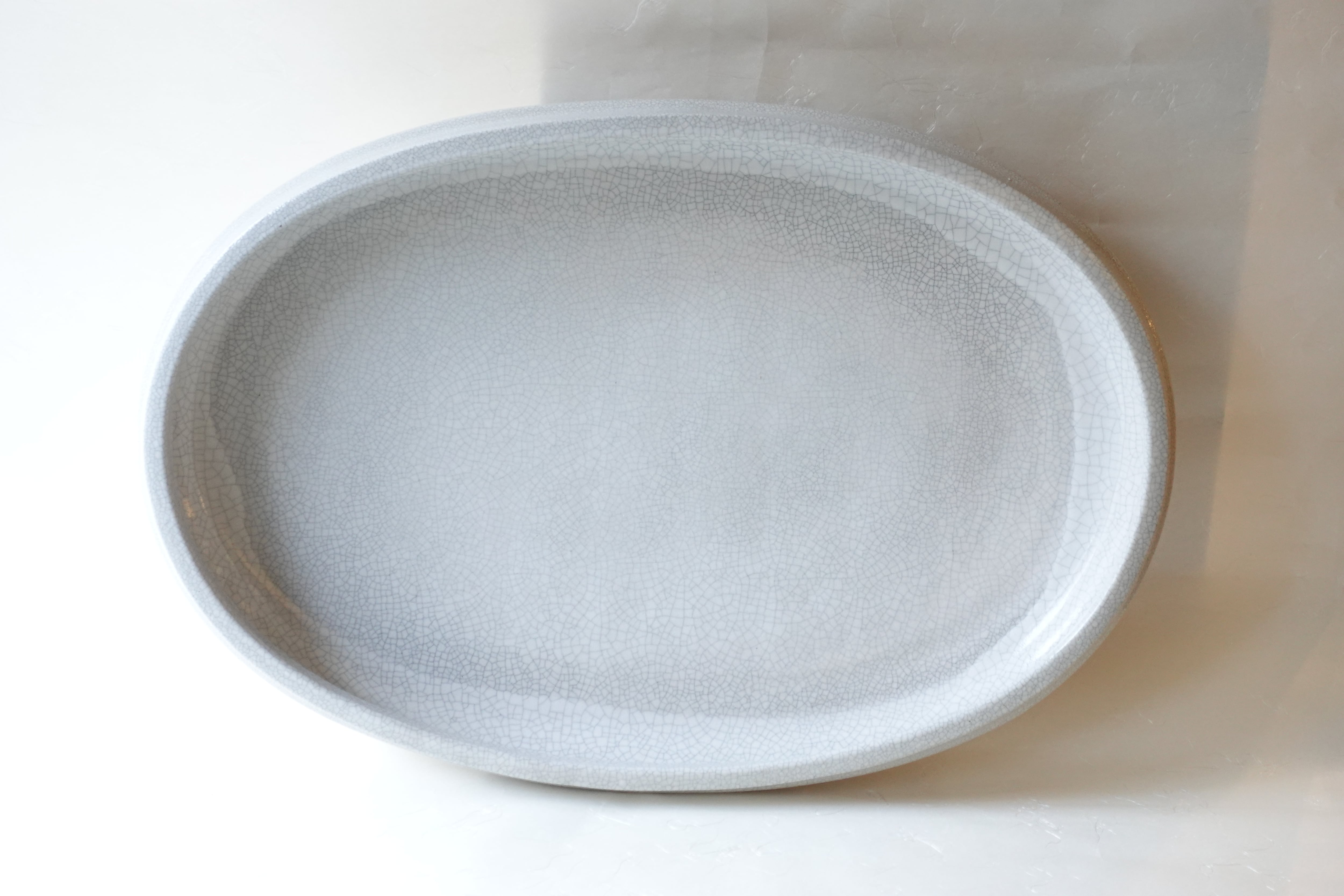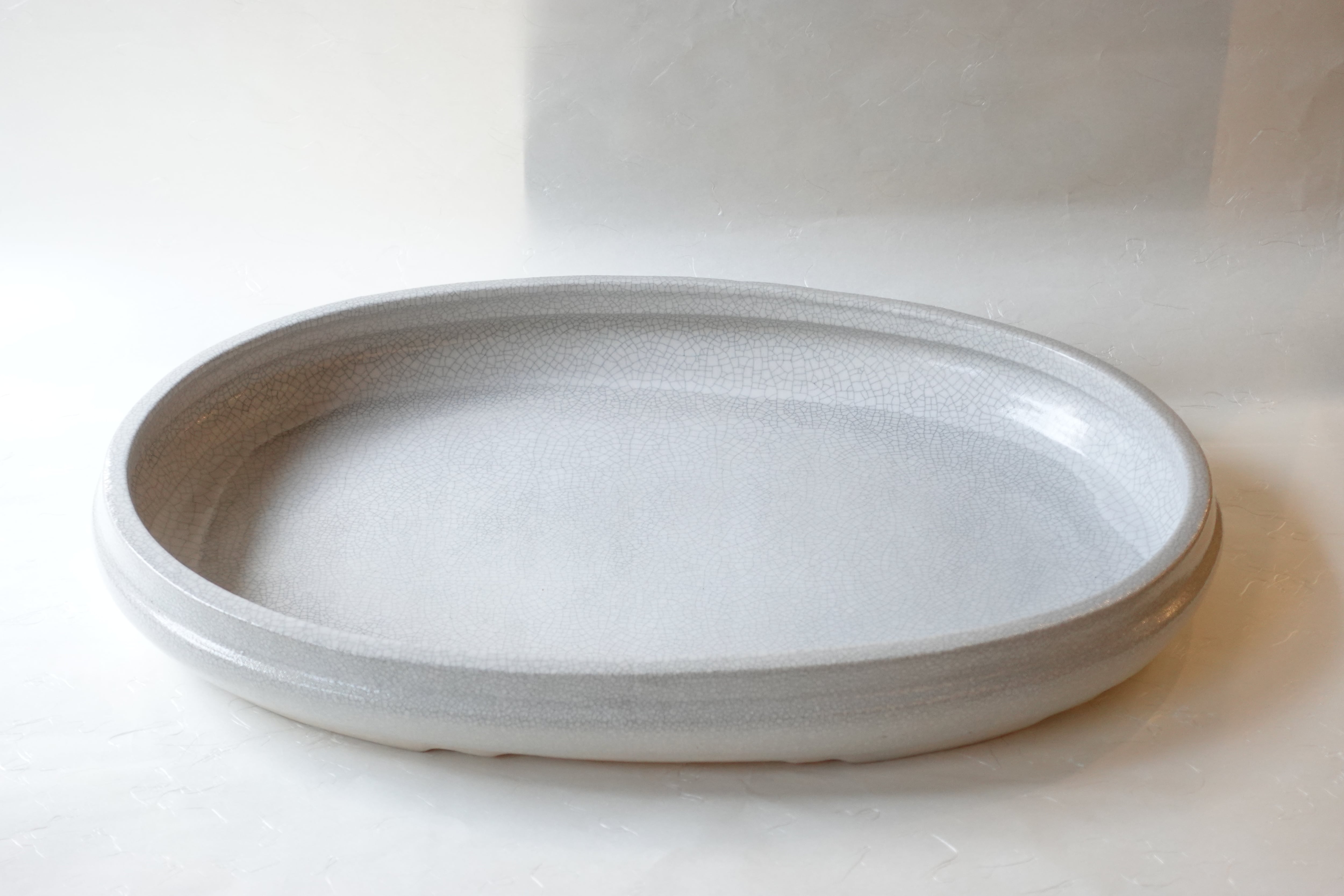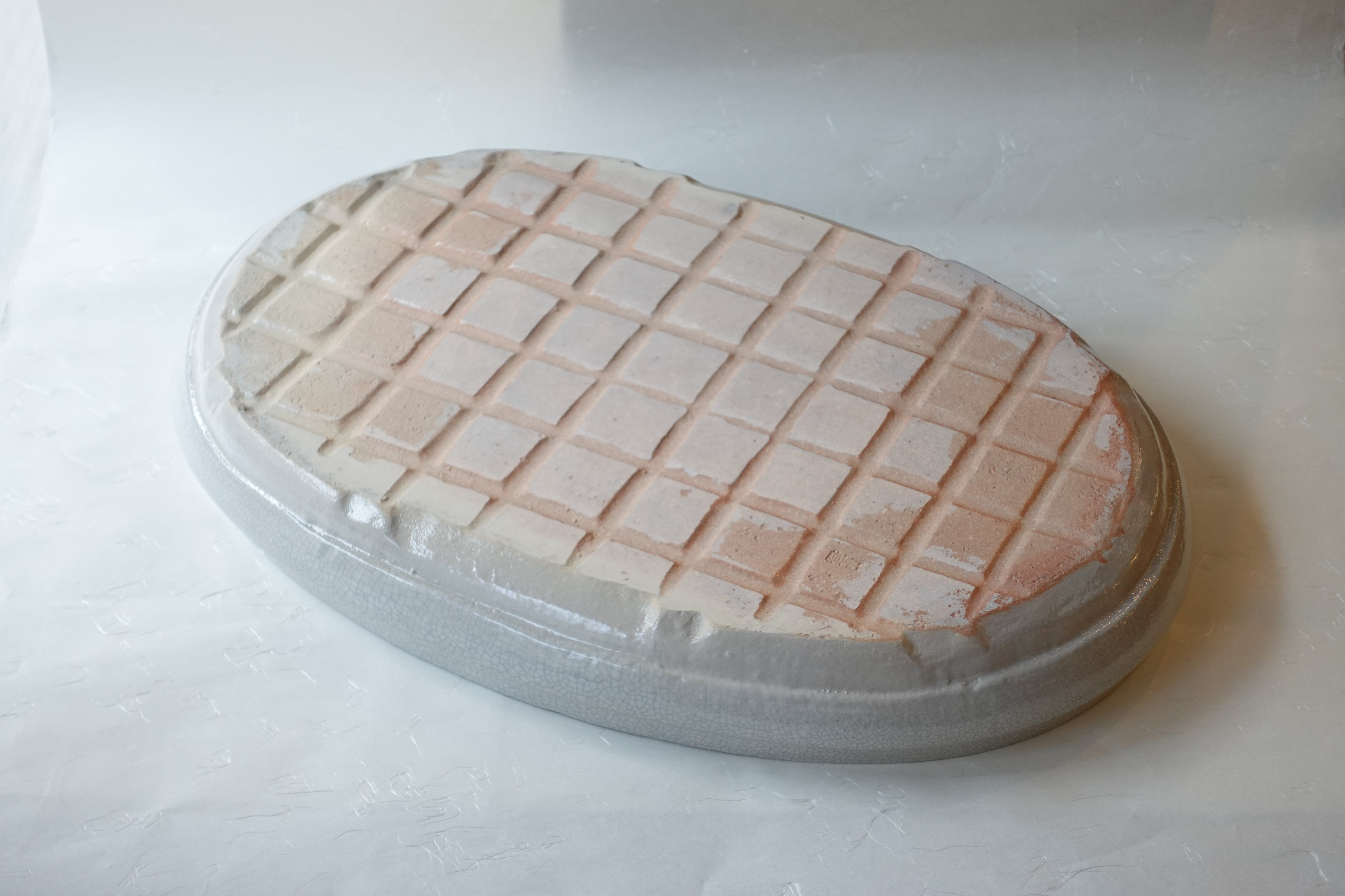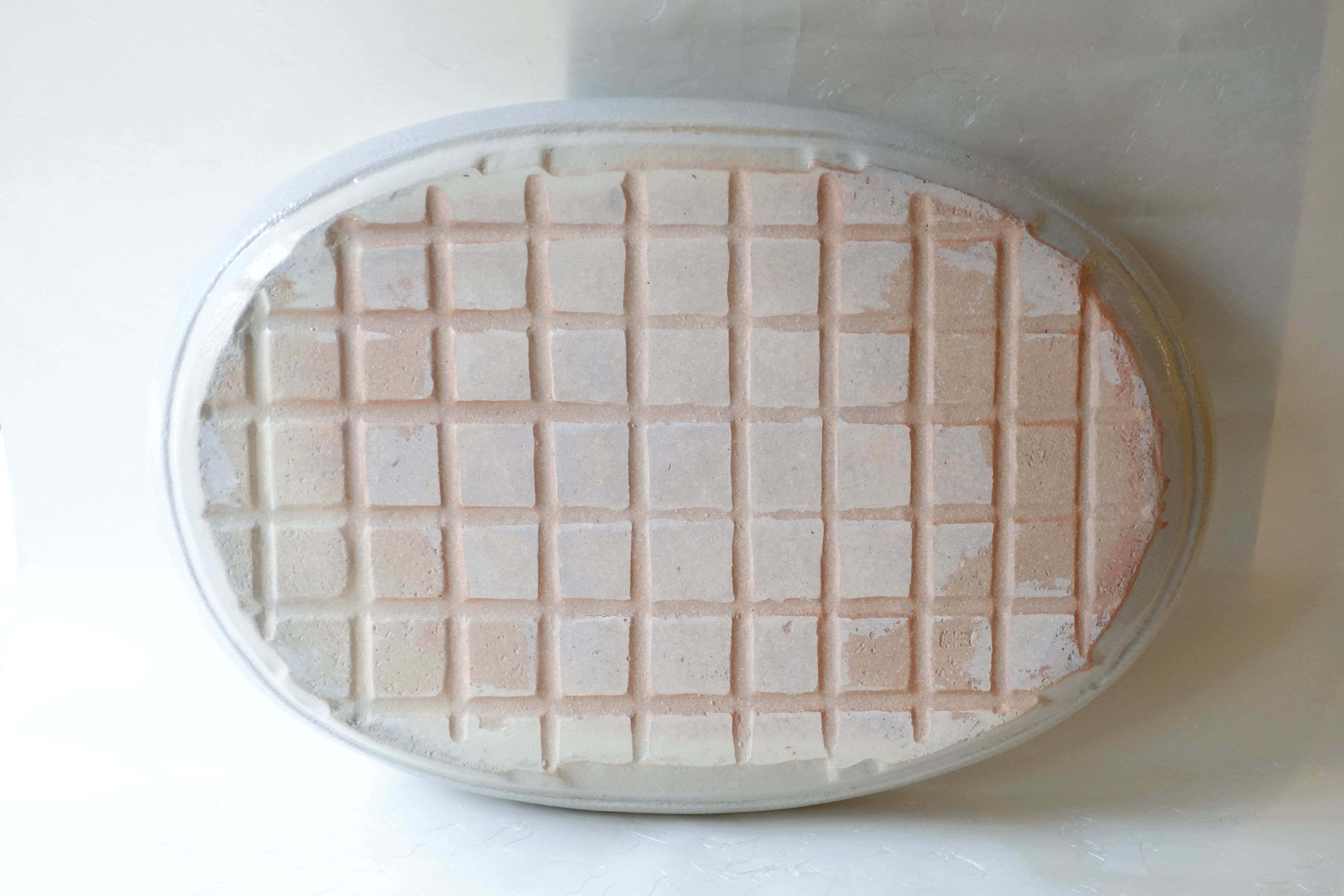 薄茶色の土を楕円形に成形し、白い釉薬を