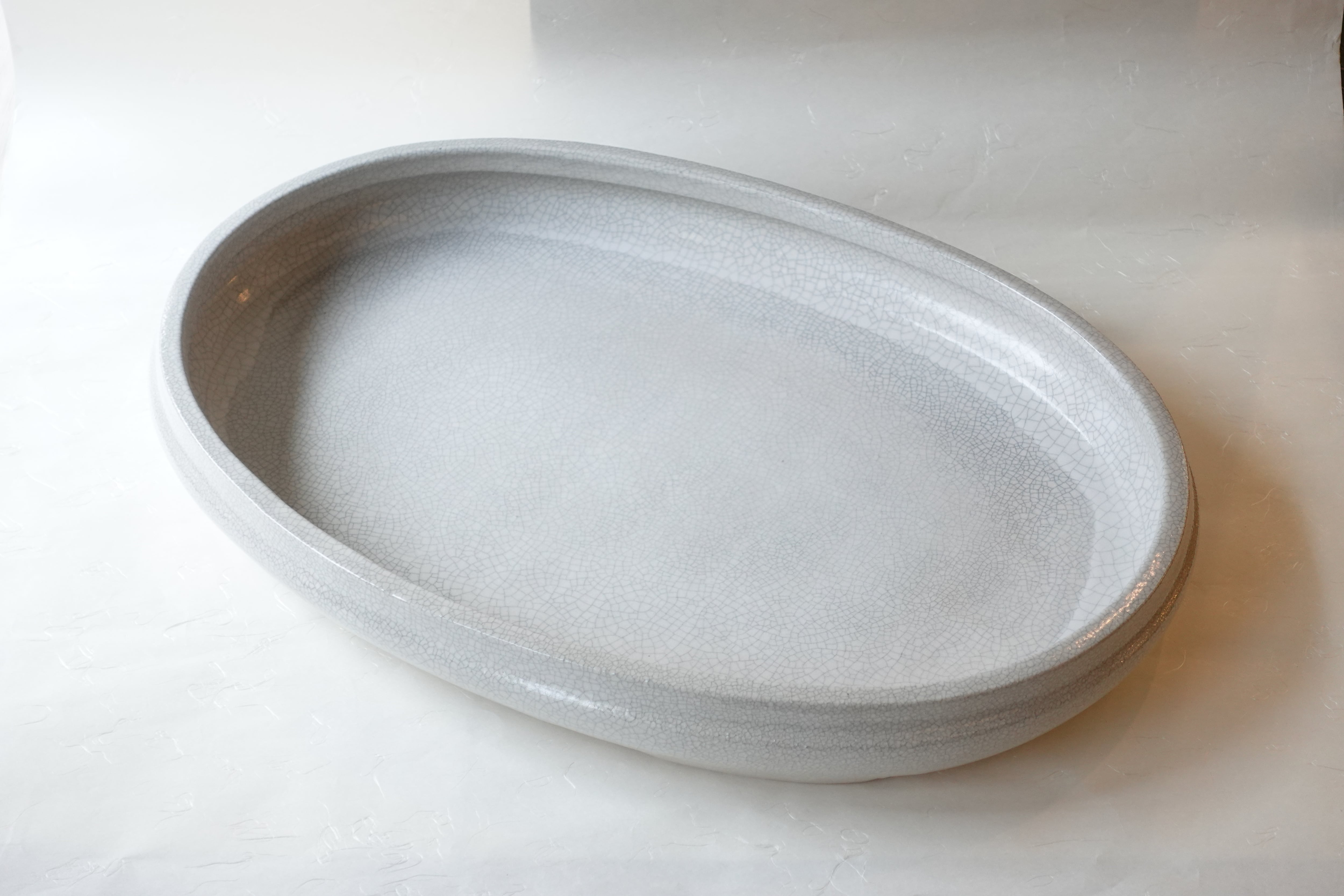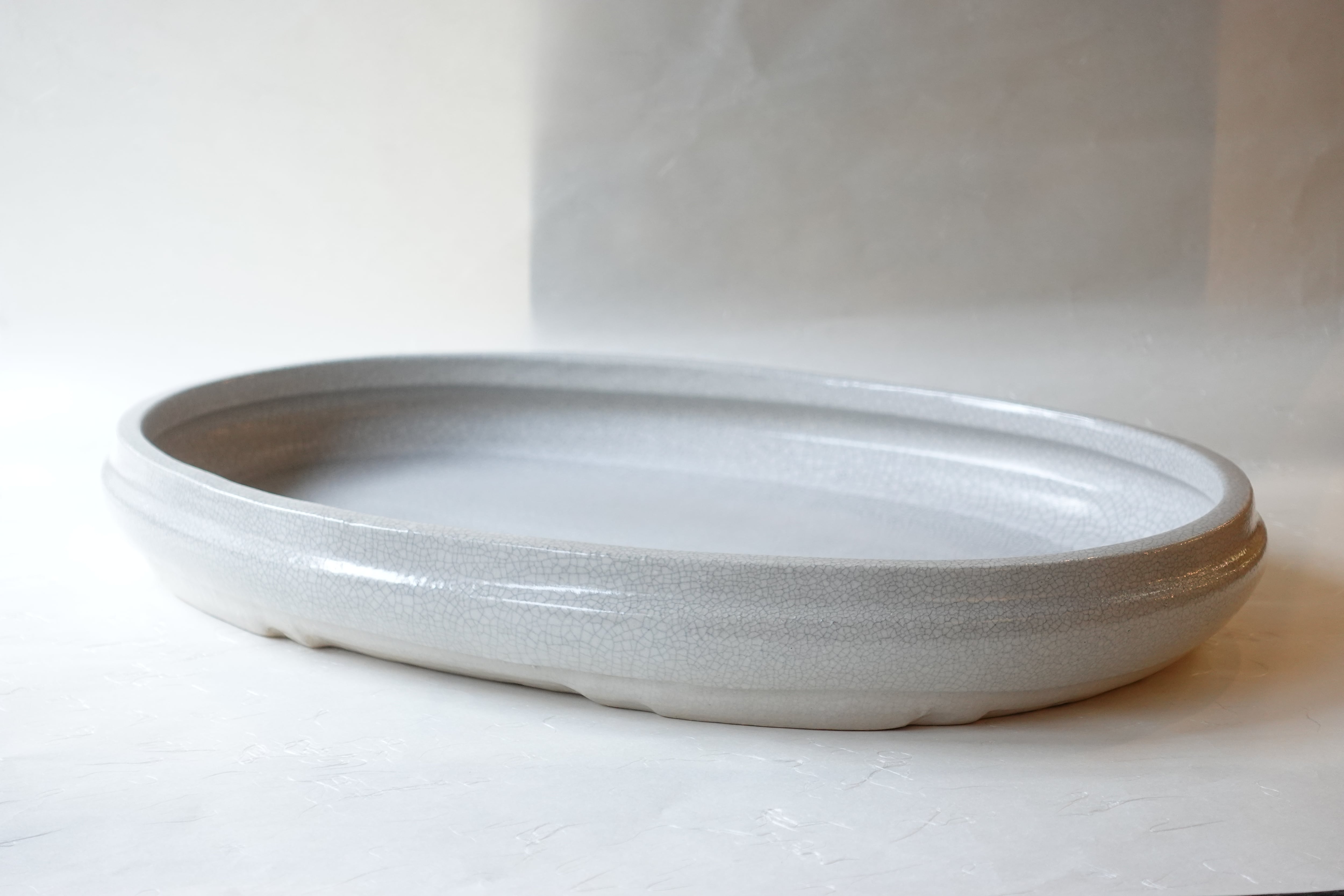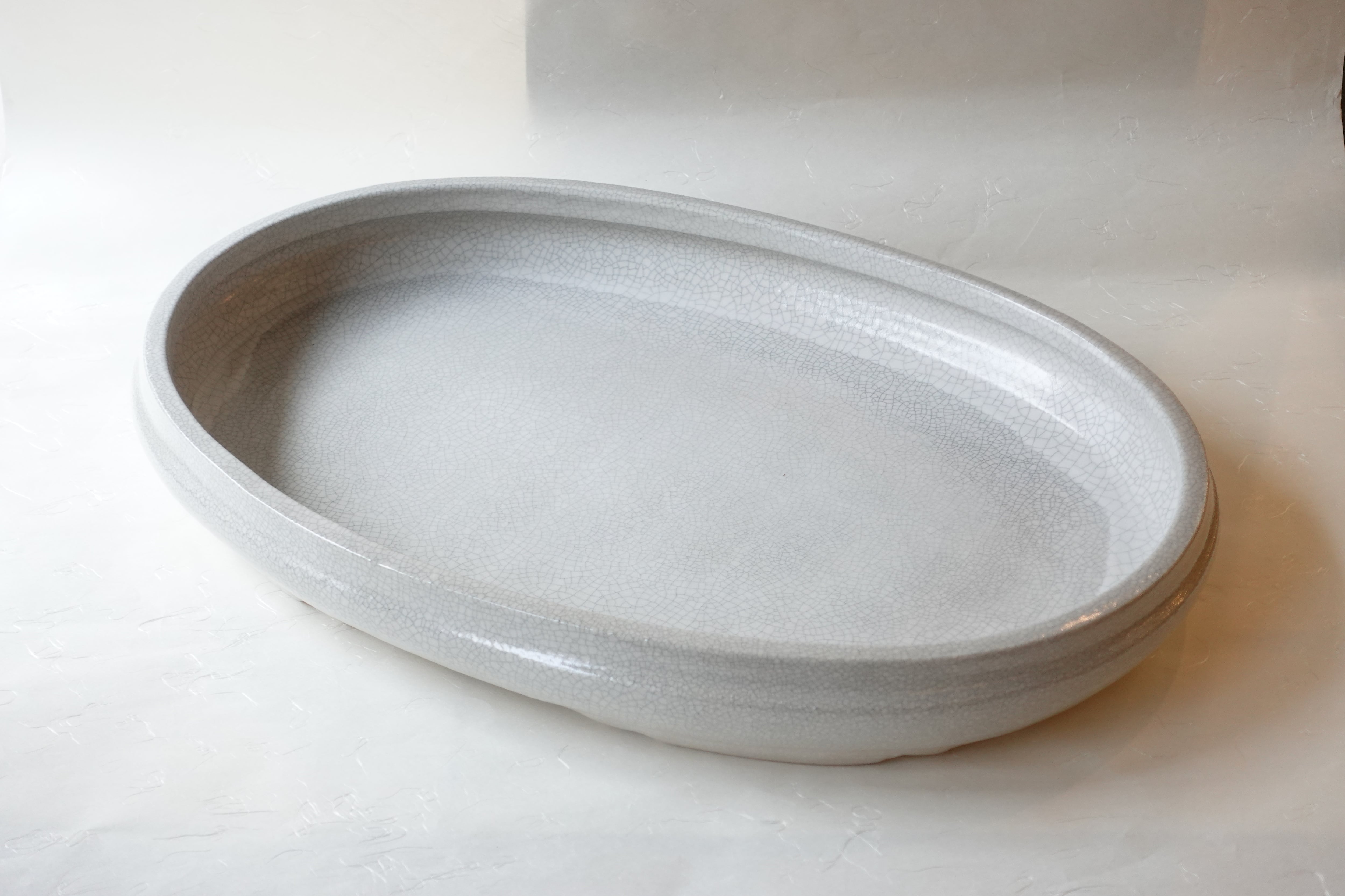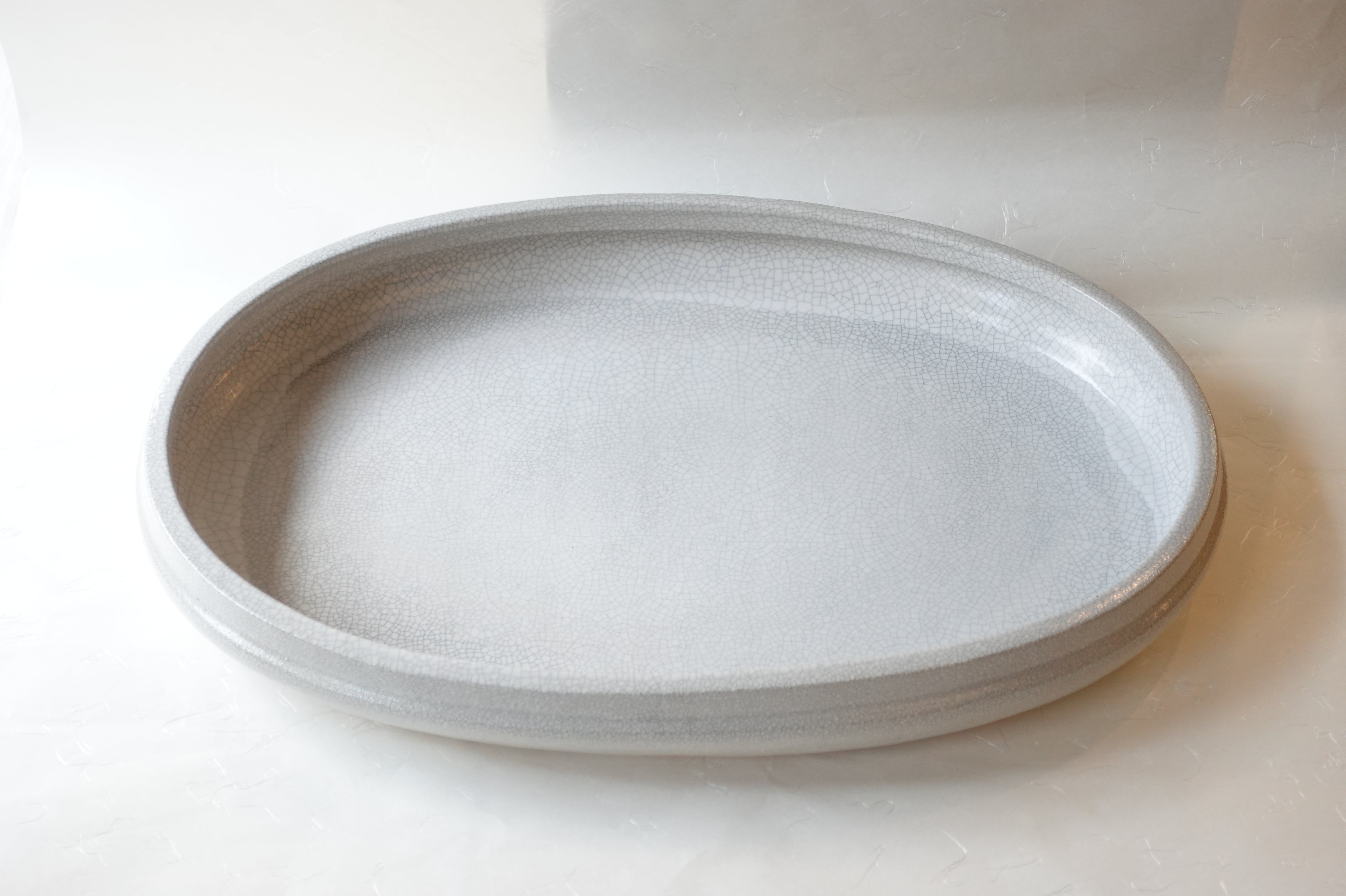 薄茶色の土を楕円形に成形し、白い釉薬を