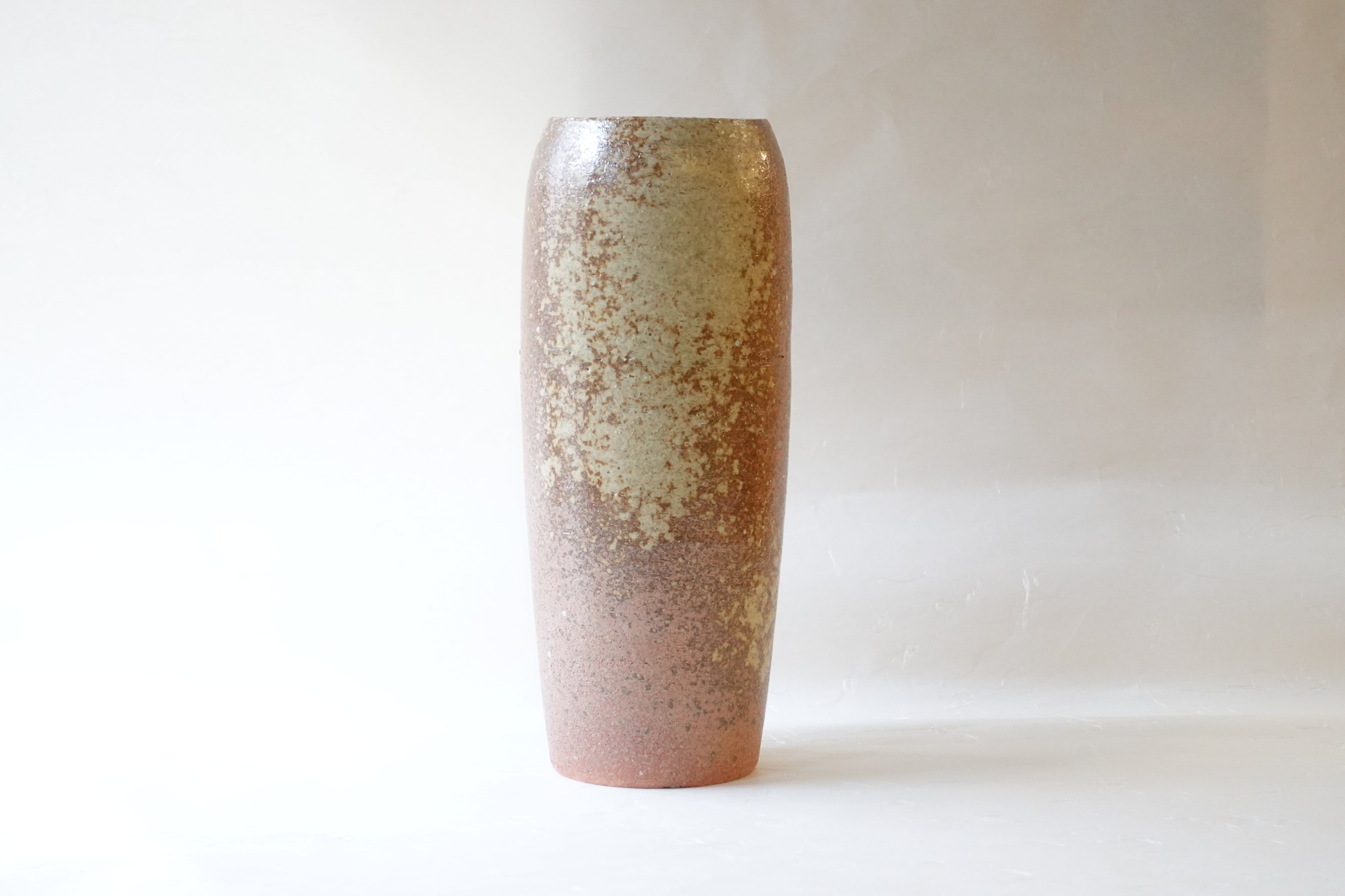 The vase is formed from coarse clay mixed with small stones and finished using a high-fired, unglazed technique.