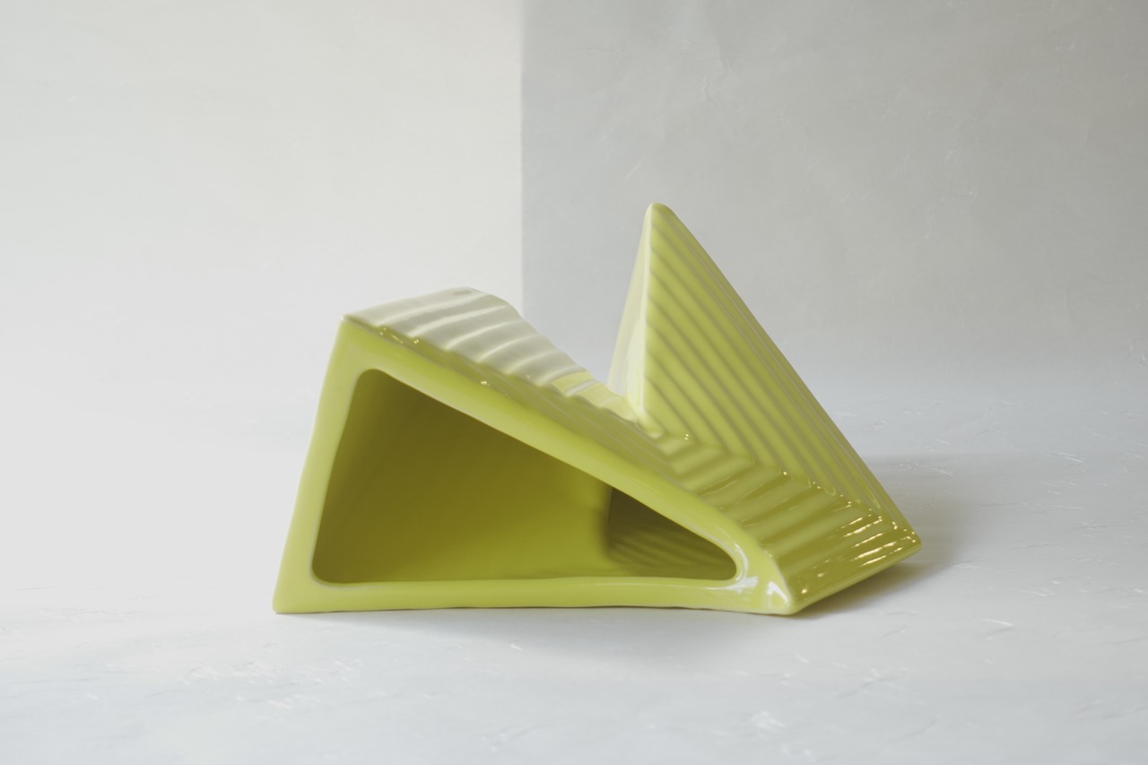 A triangular form can be seen from every angle, and the piece features an asymmetrical design that is irregular both vertically and horizontally.