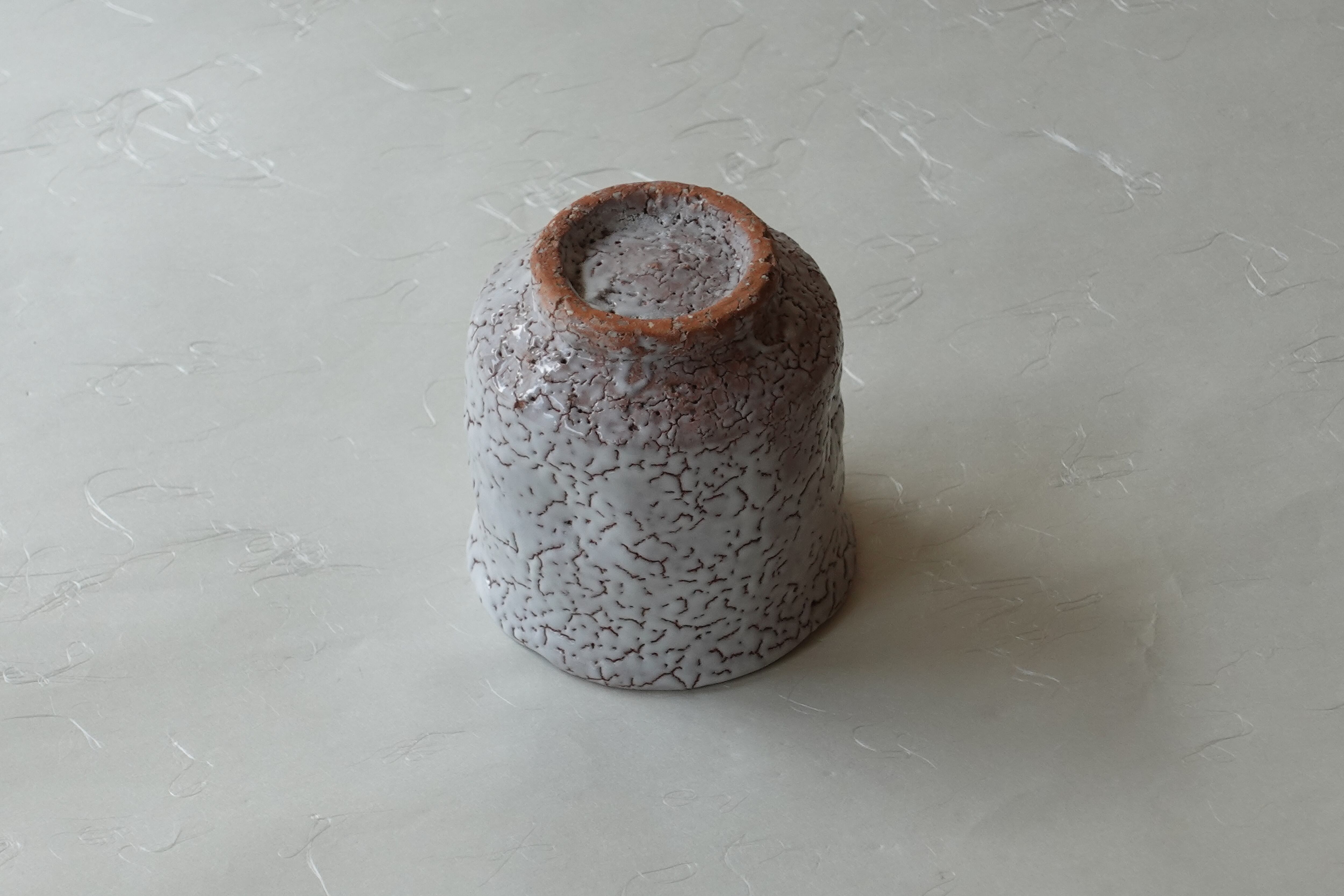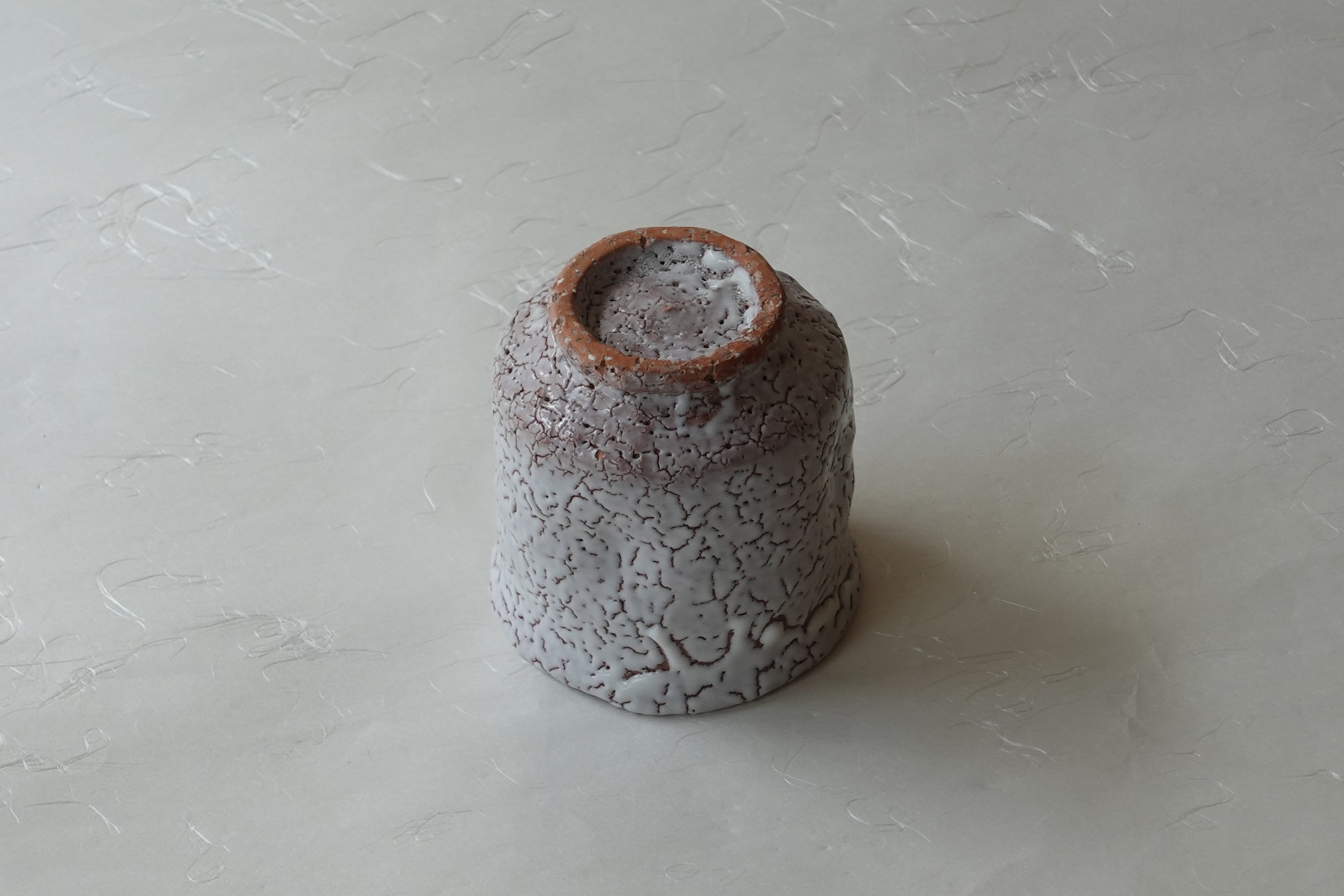 此茶杯采用夹杂小石子的褐色陶土,经拉坯成型,