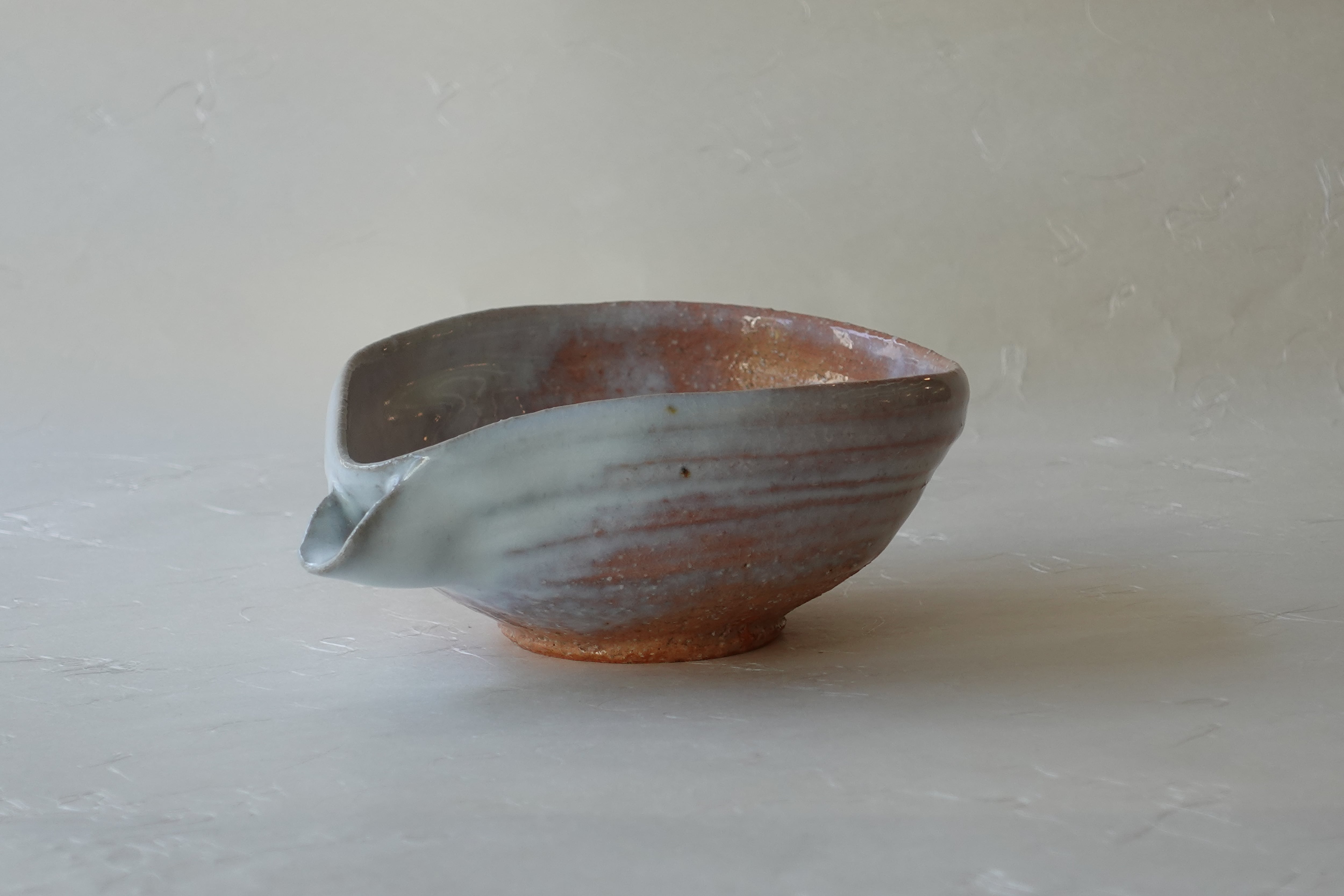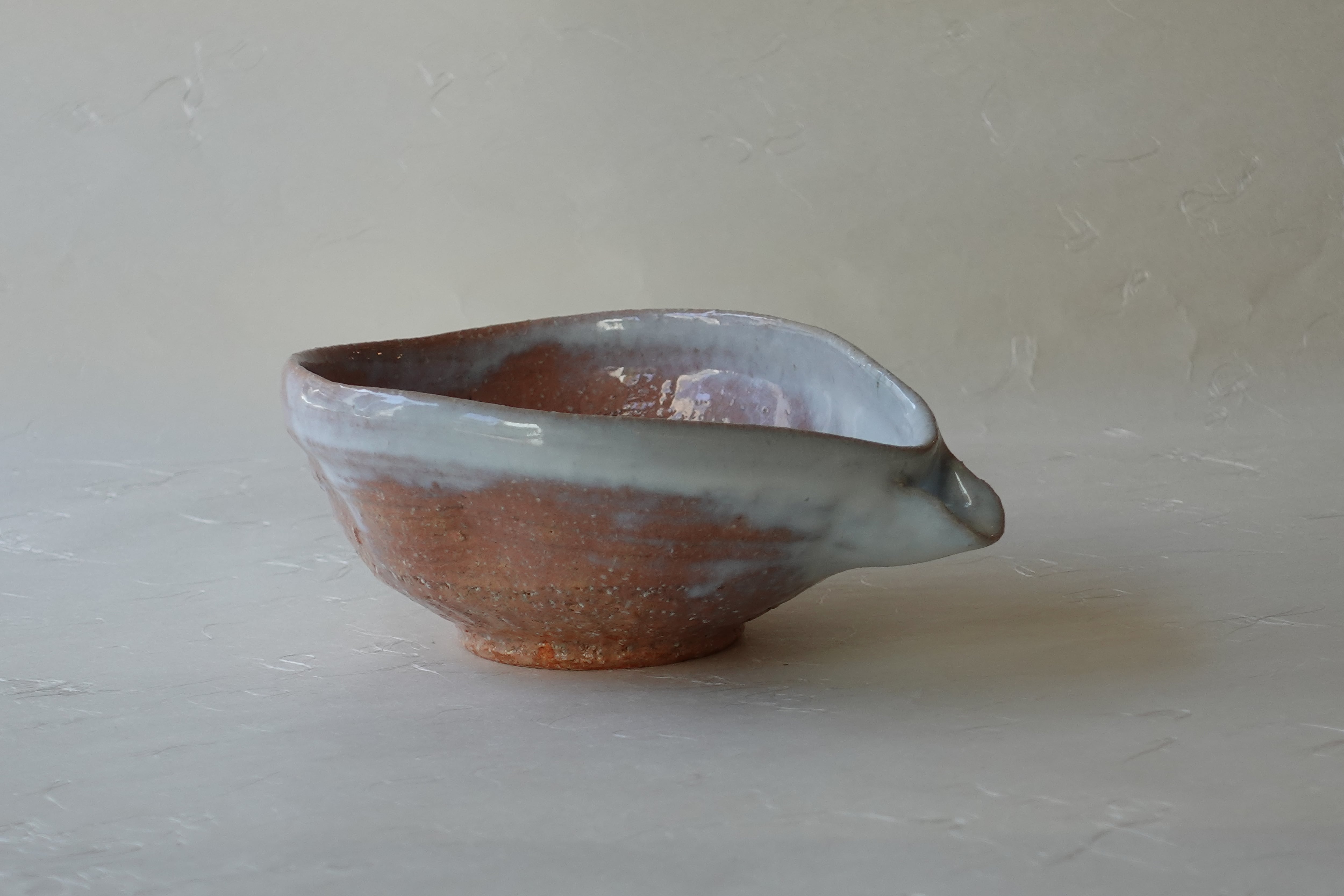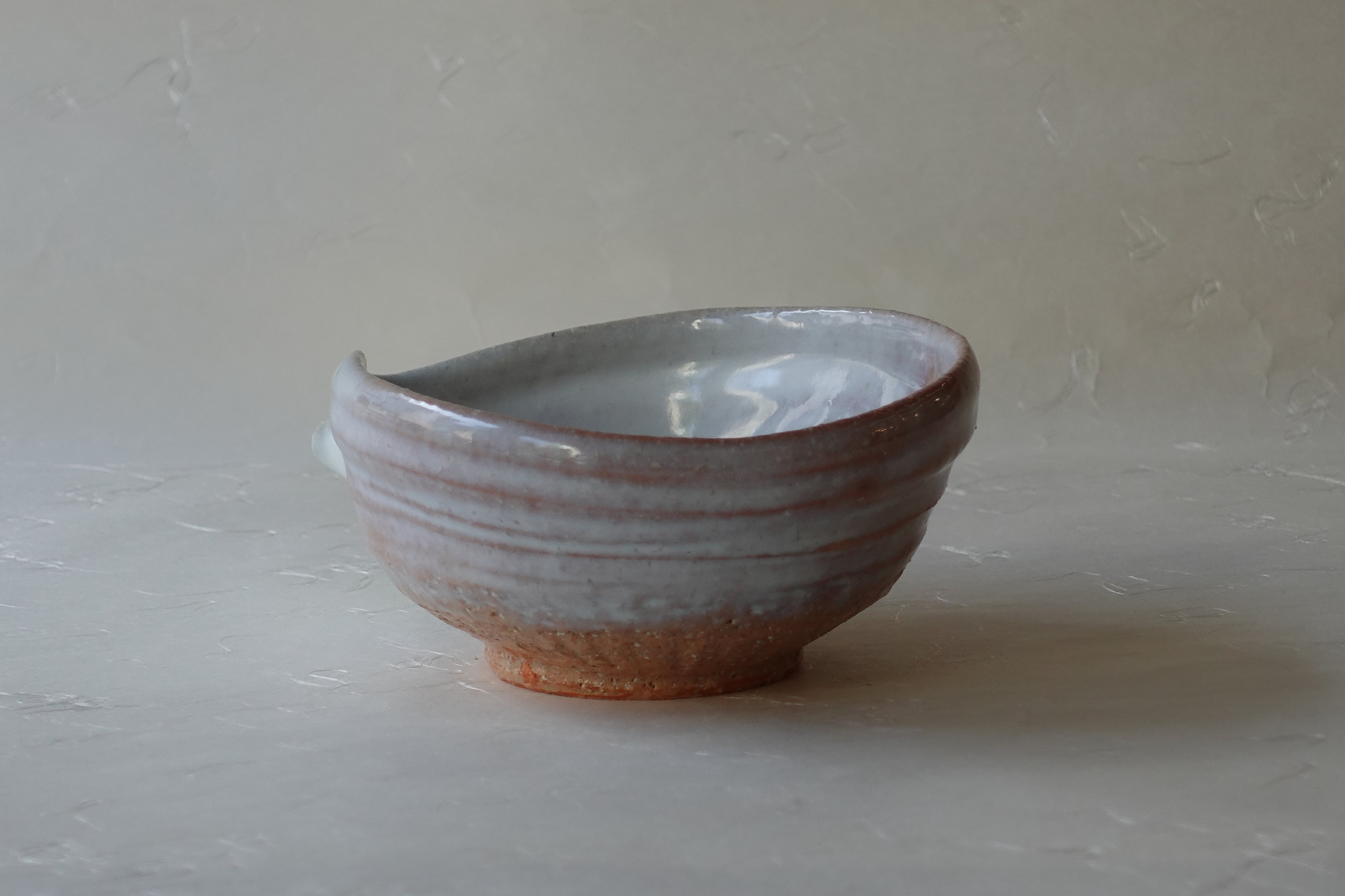This is a Hagi ware katakuchi bowl, formed on a potter’s wheel from brown clay mixed with small stones and finished with a white glaze.