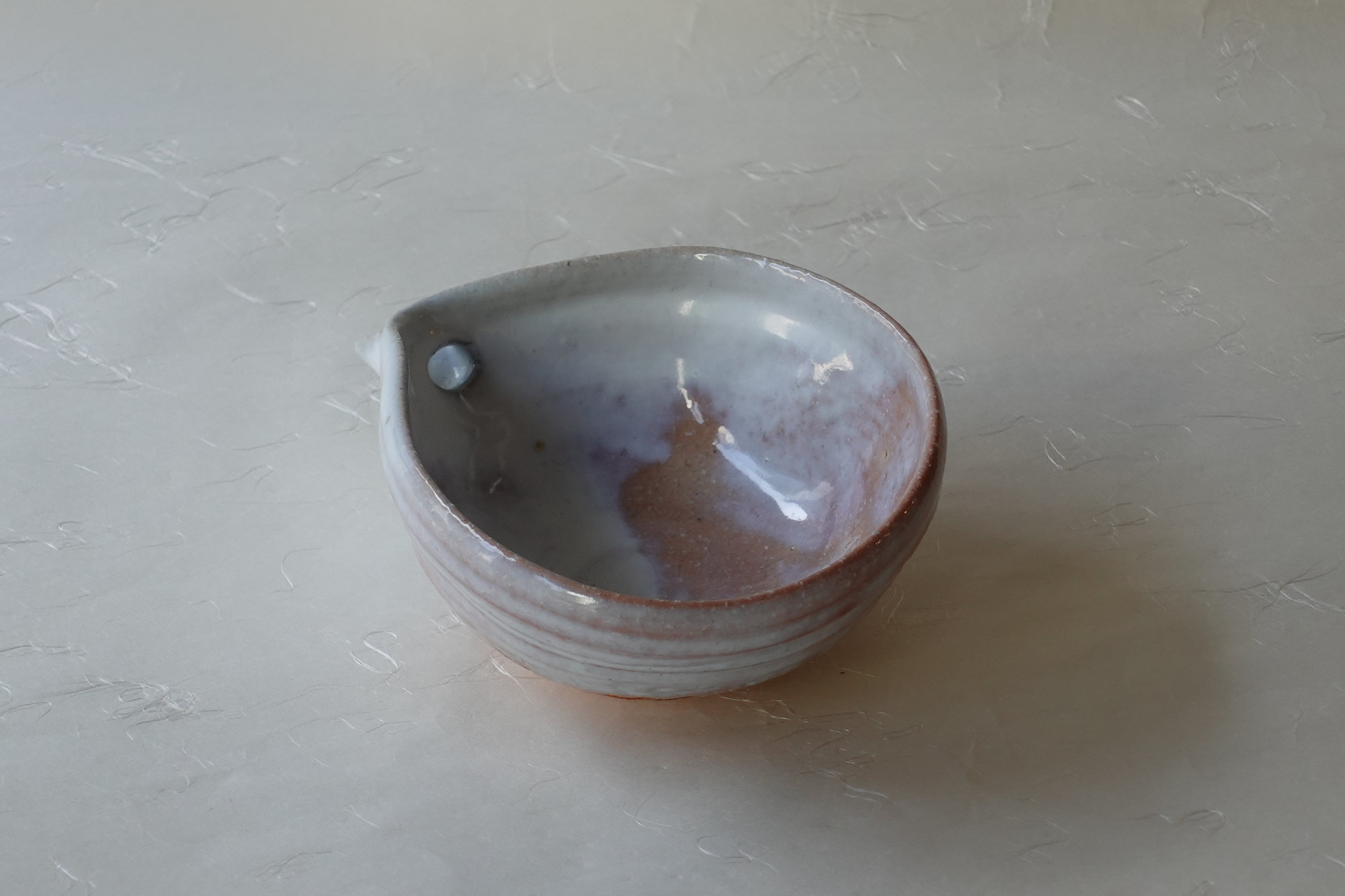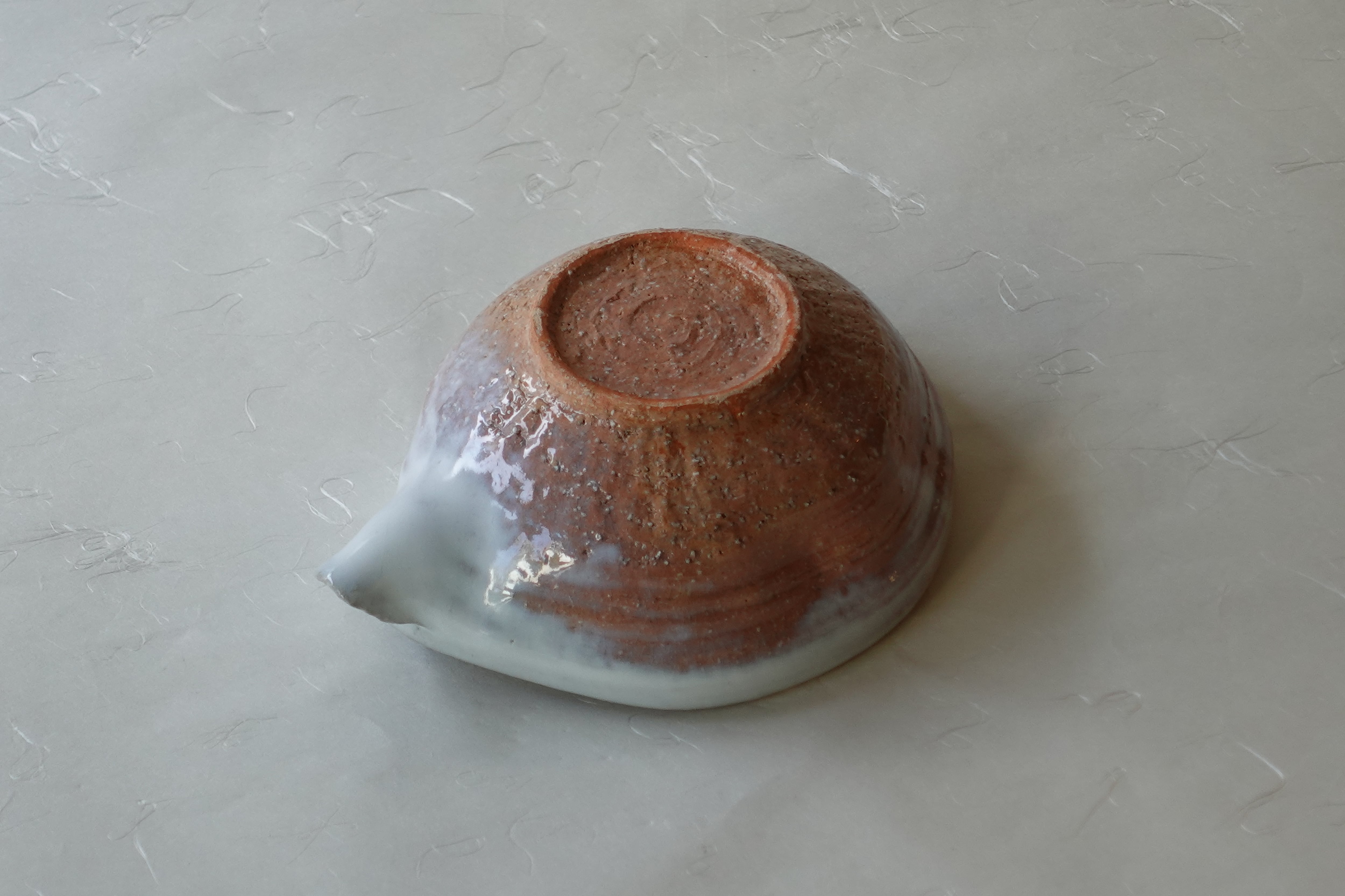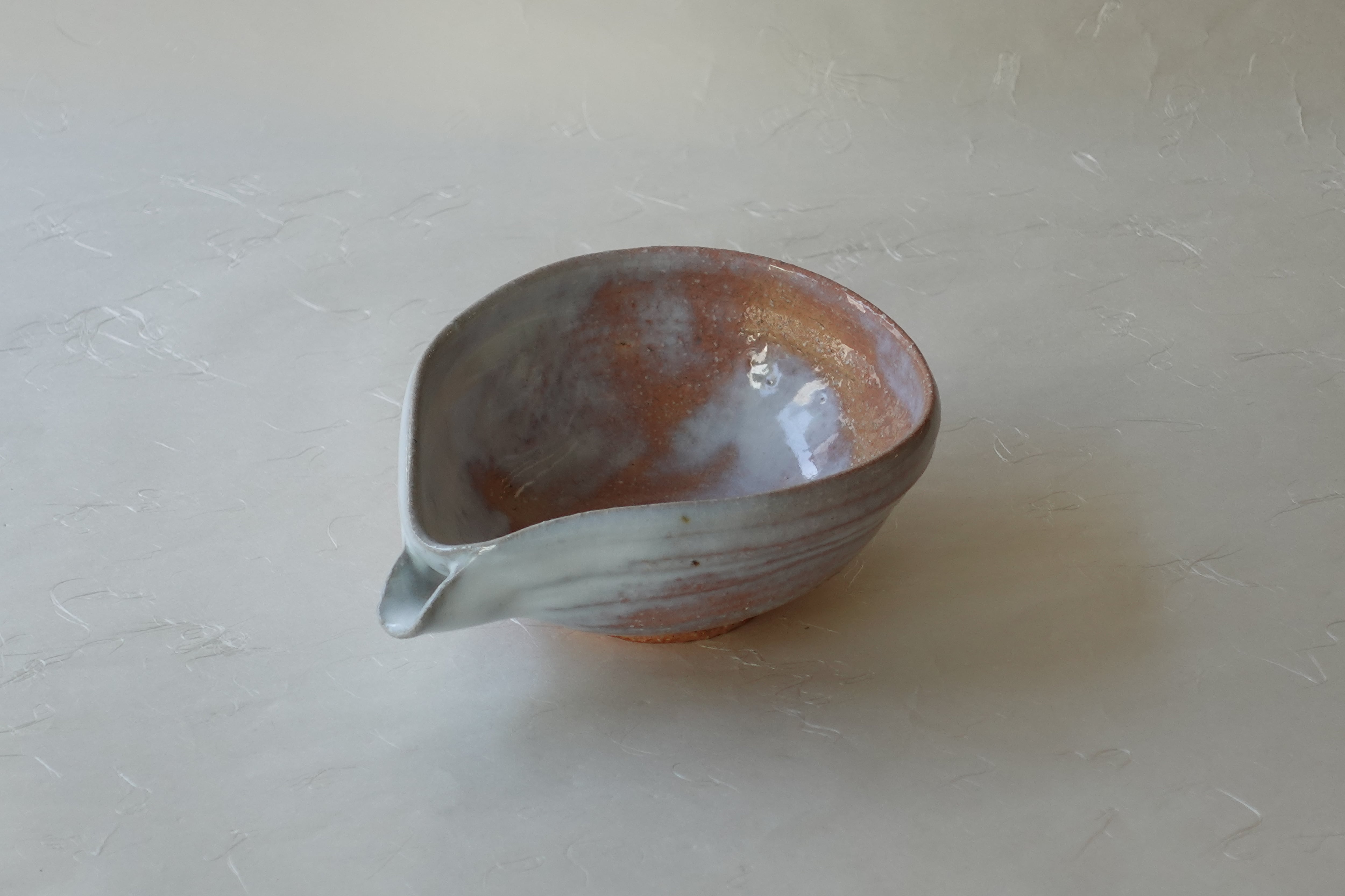 This is a Hagi ware katakuchi bowl, formed on a potter’s wheel from brown clay mixed with small stones and finished with a white glaze.