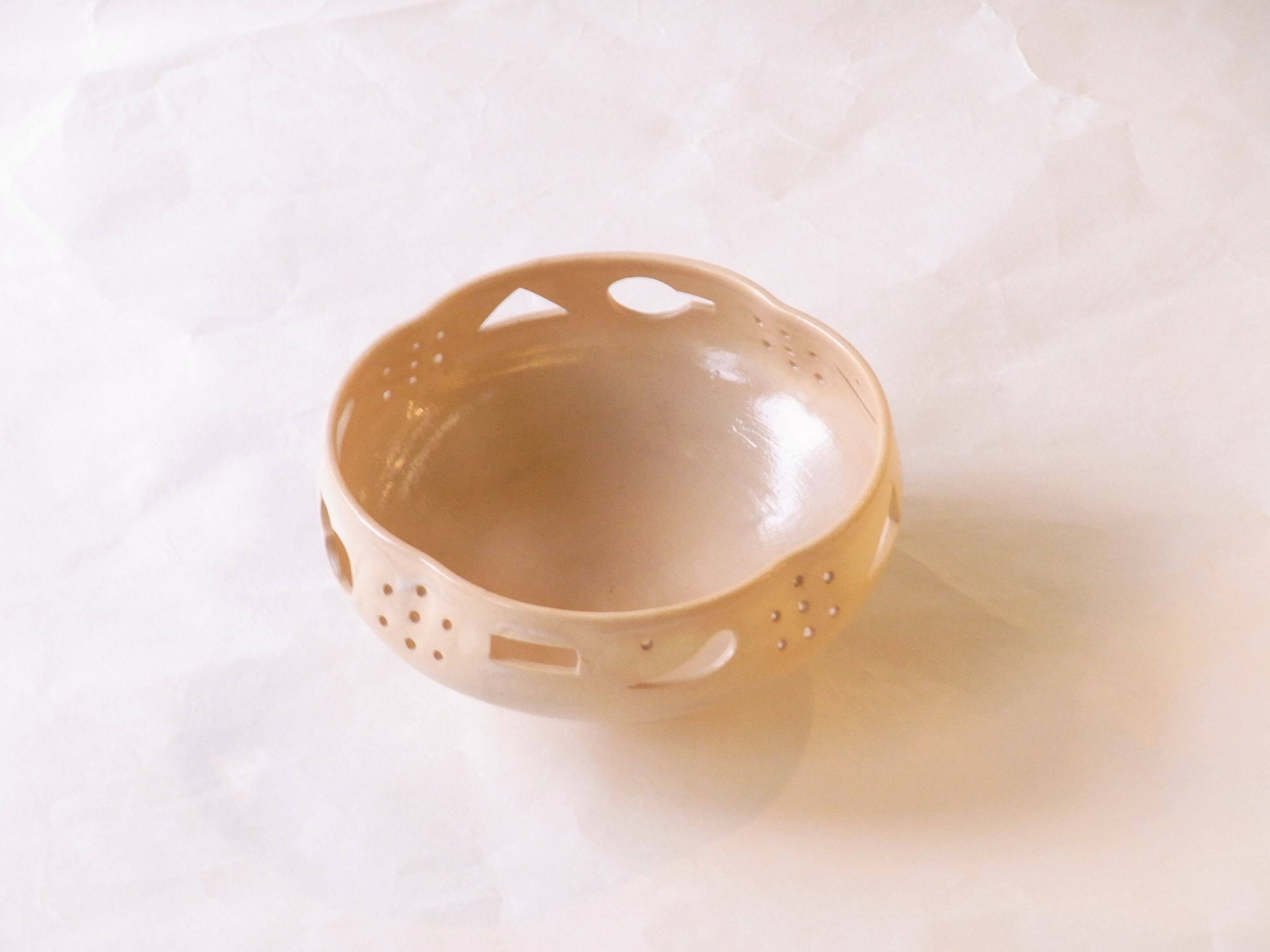 薄手に挽いた生地に透かしを彫り、口の部分を少し変形させて作られています。
