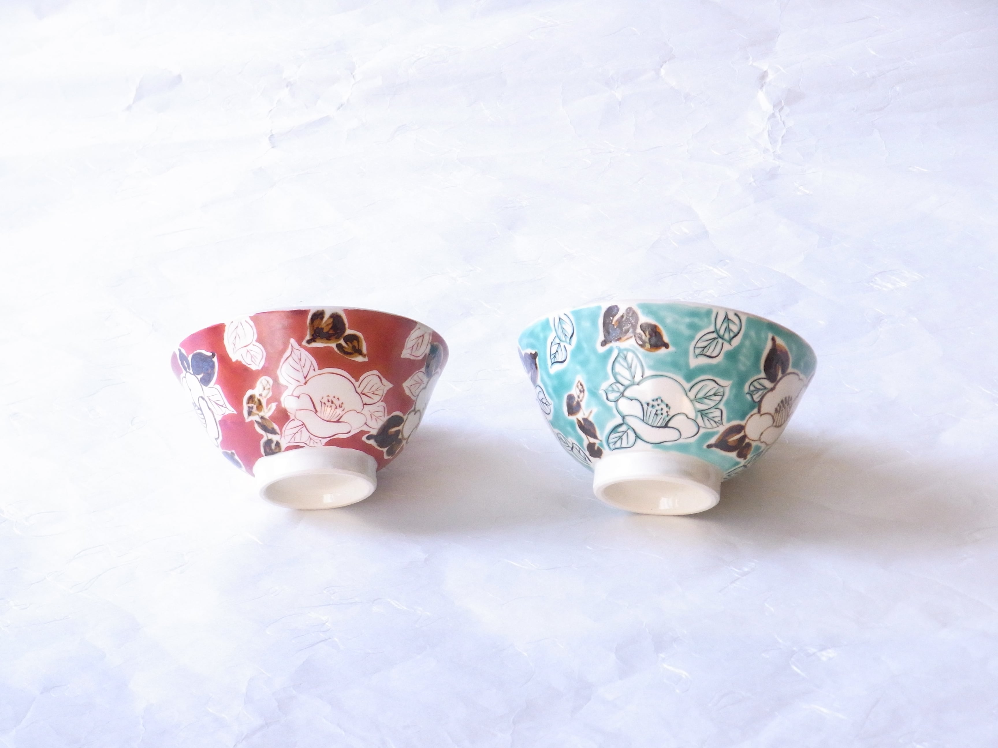 大きいご飯茶碗は、外側にきれいな薄い緑色と鉄絵で描かれた椿が二種類描かれていて