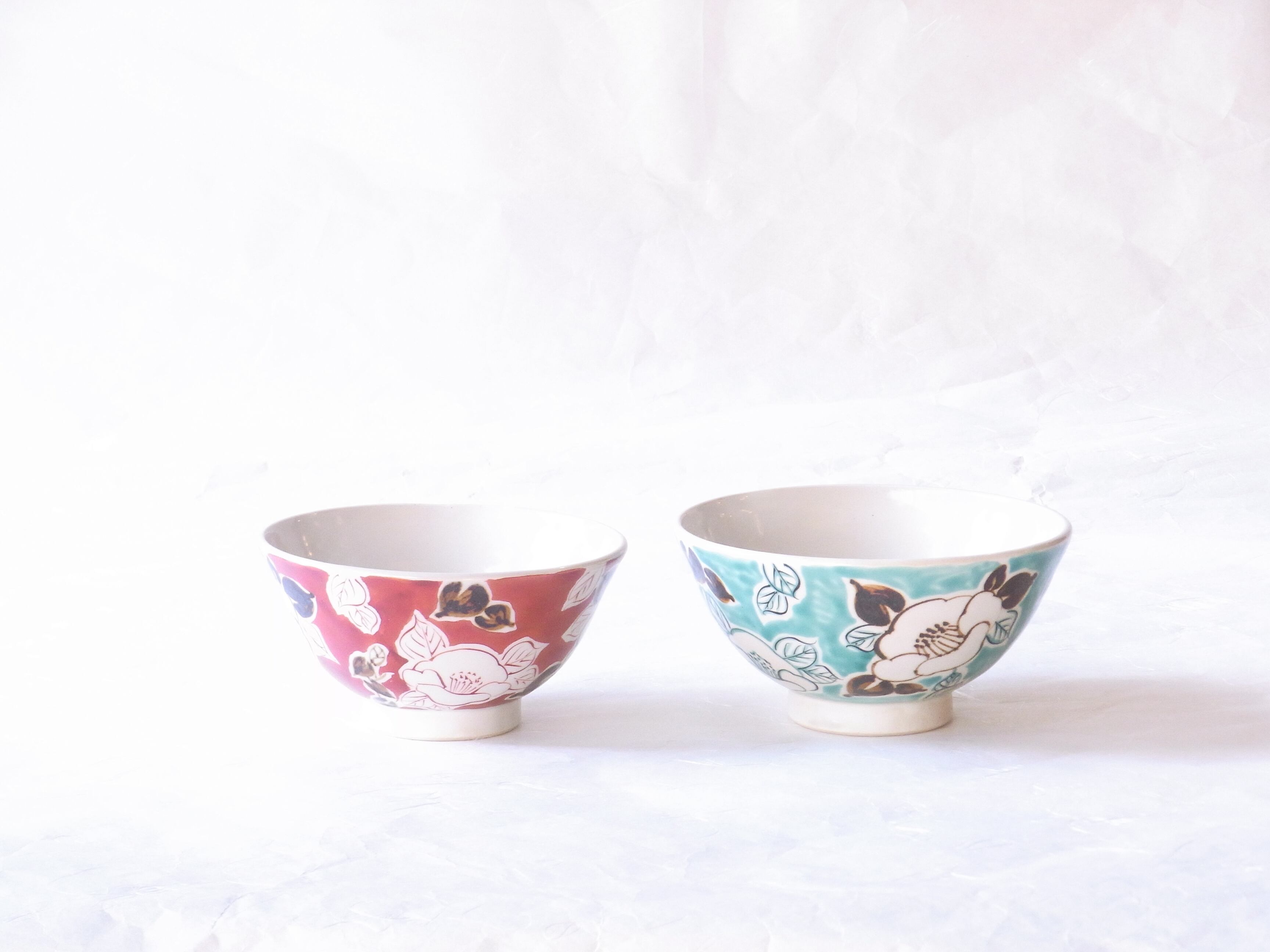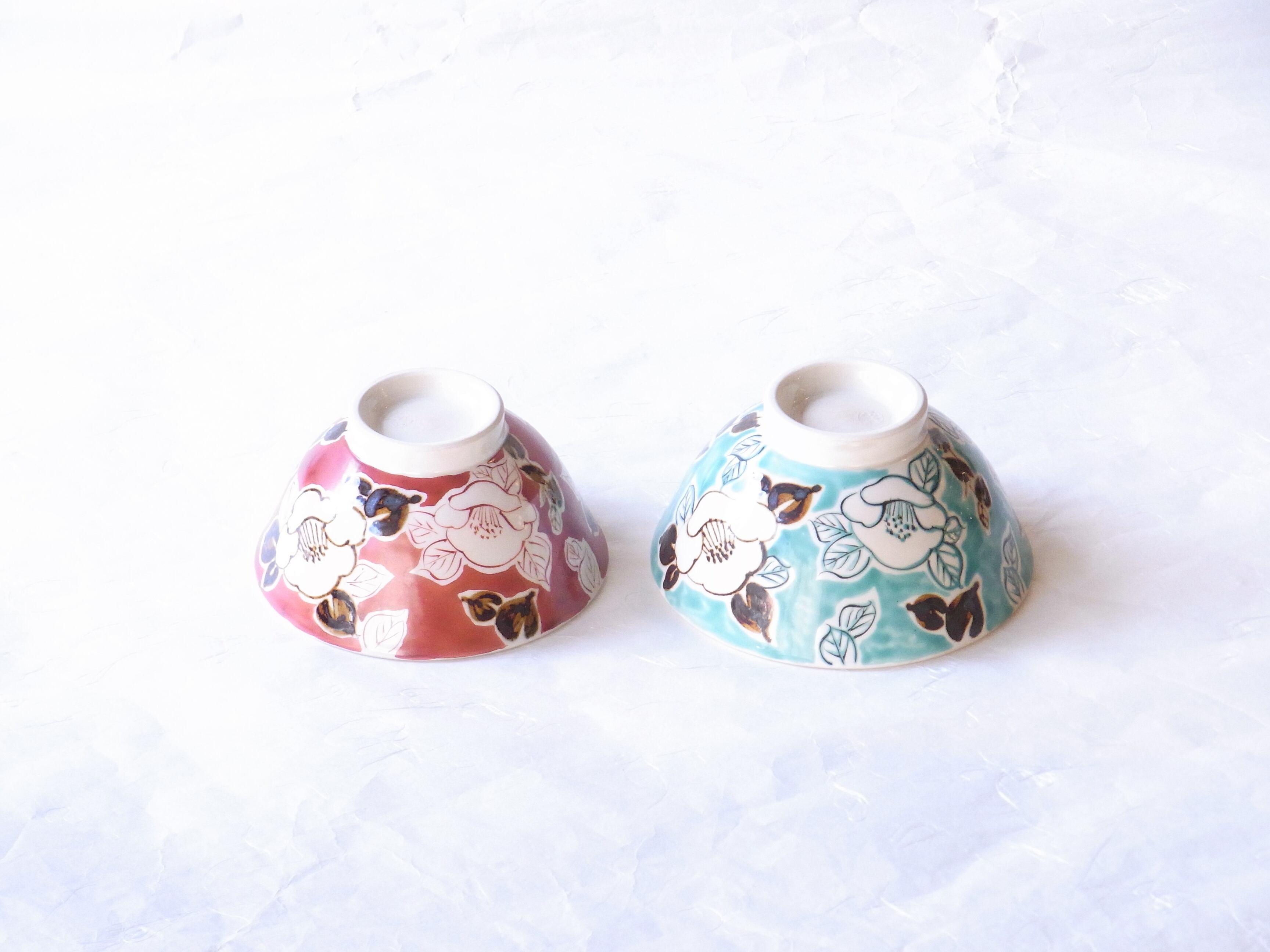 小さい方のご飯茶碗は、外側に赤絵で描かれた椿と鉄絵で描かれた椿が