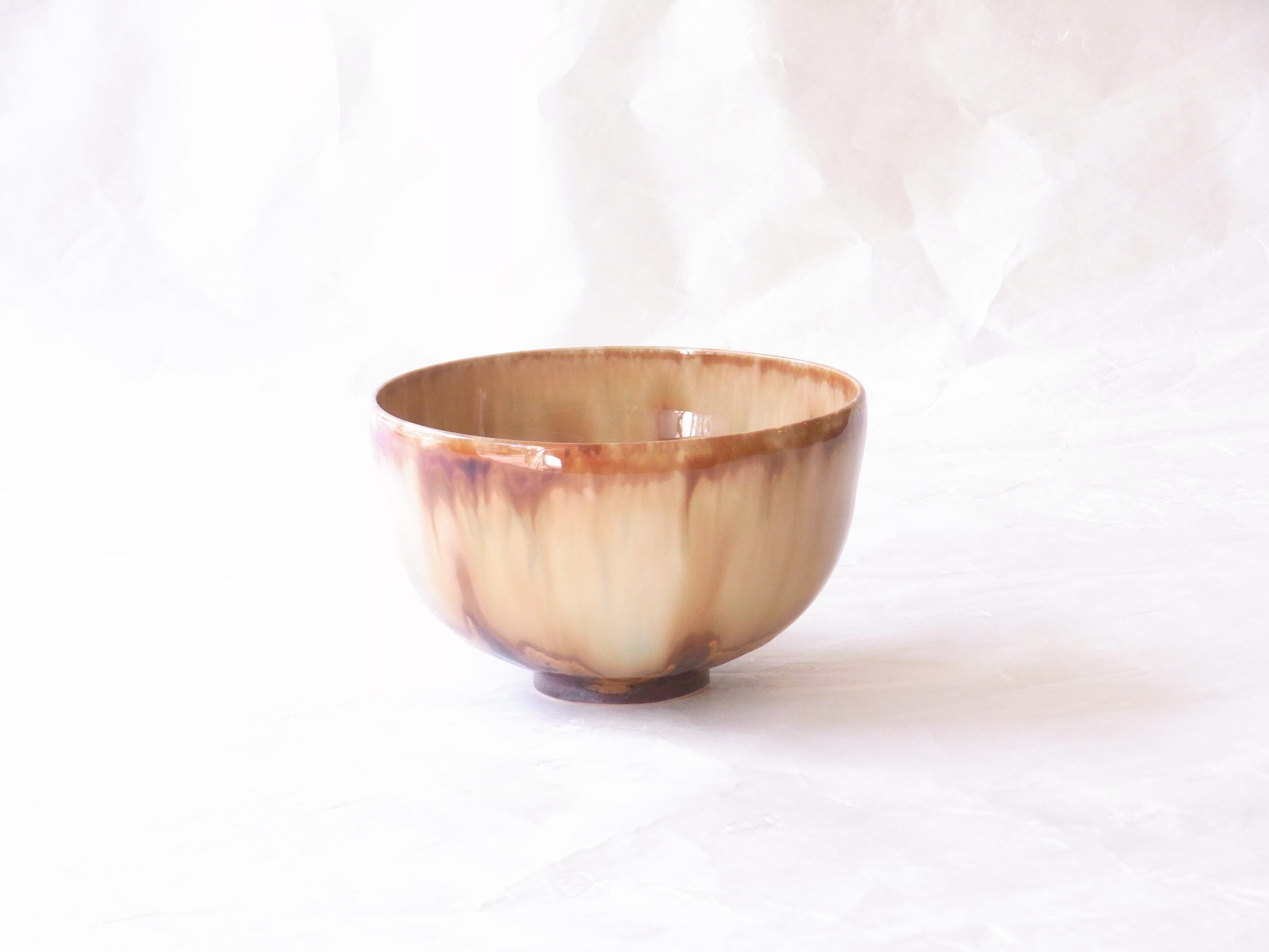 この抹茶碗は茶色の釉薬の流れがオーロラのような風合いになっているのが