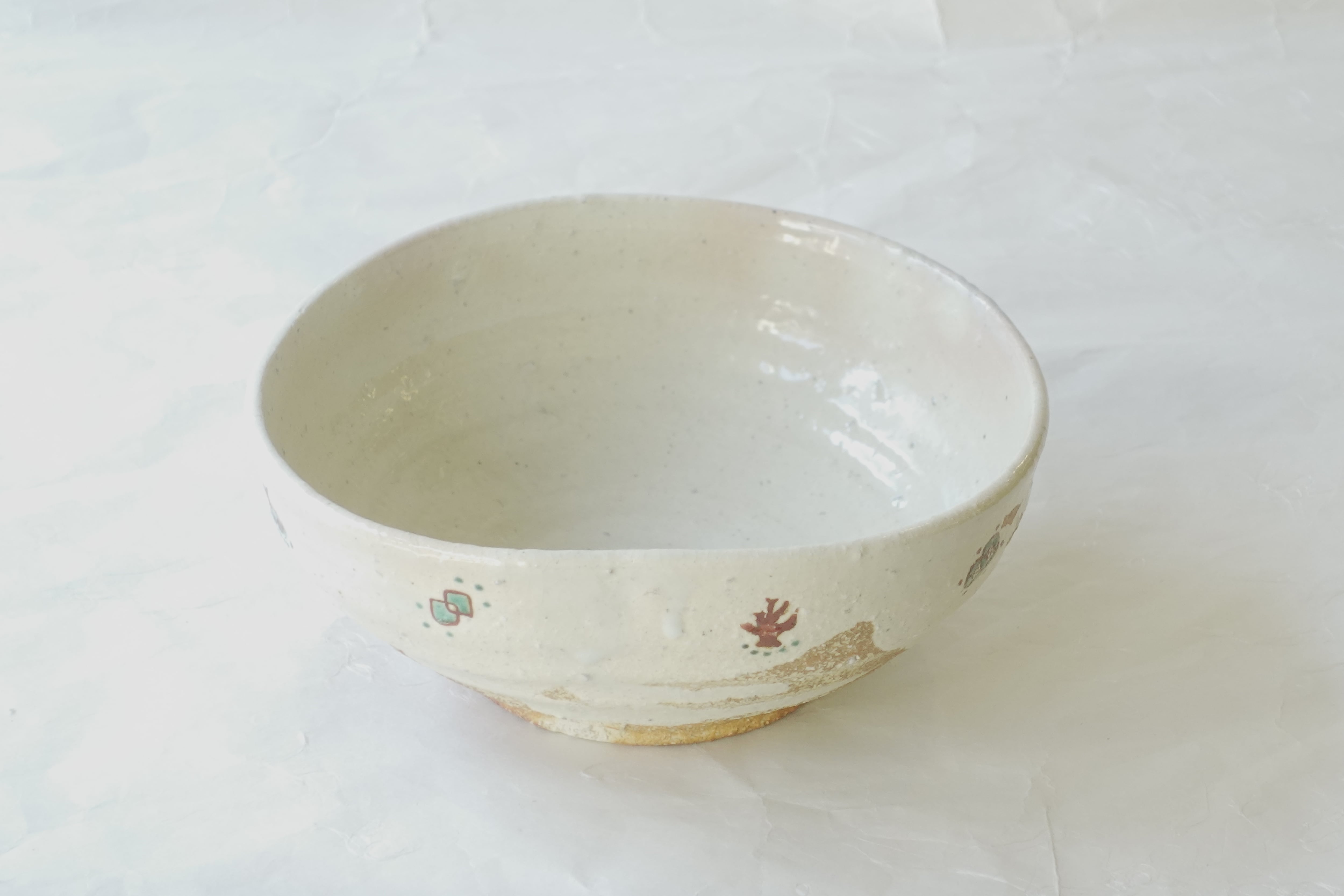 白い釉薬がかけられ、外側には宝尽くしの柄が描かれています。