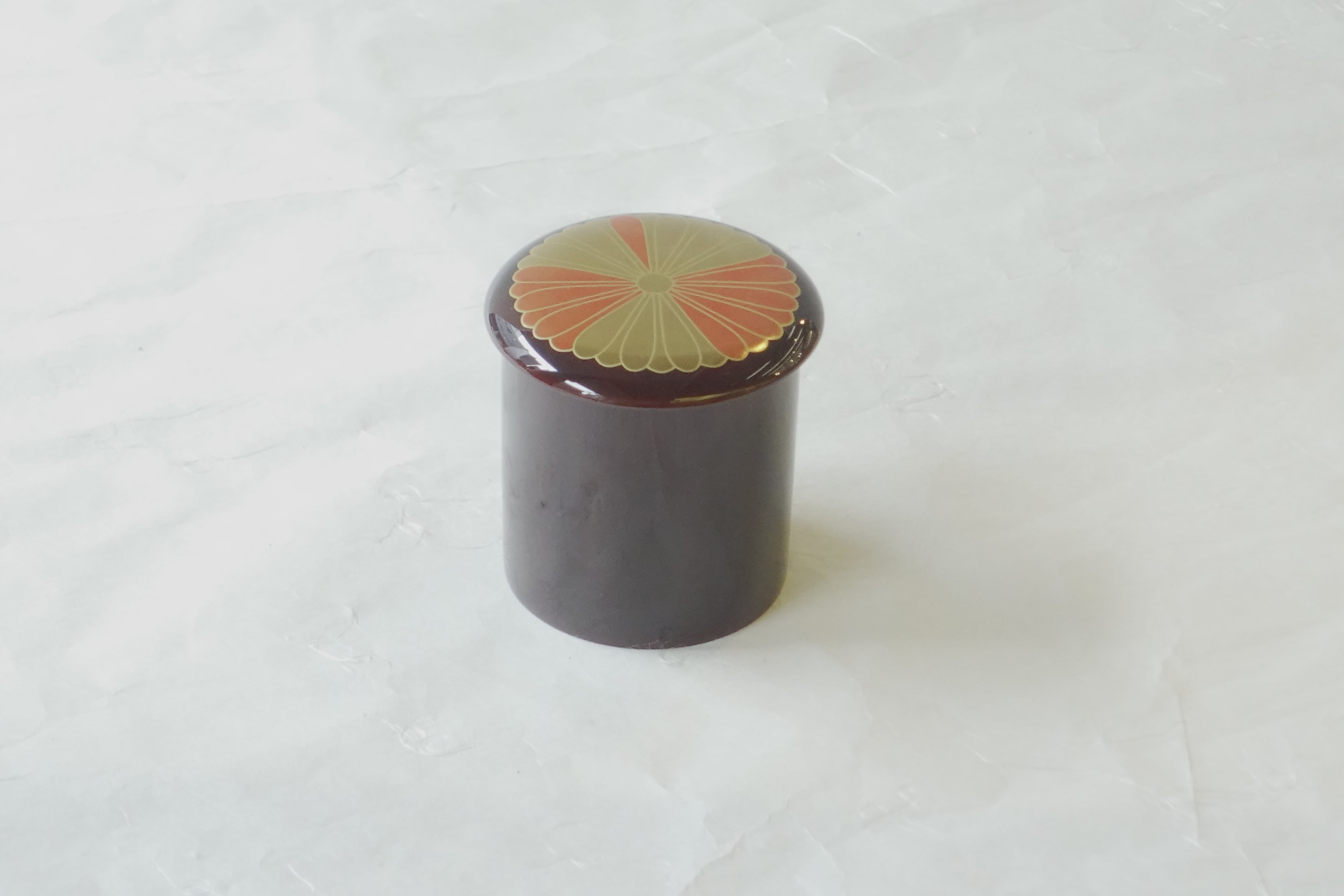 The wooden base is finished in subdued tame-nuri lacquer, giving it a simple and refined appearance. On the surface of the lid, a chrysanthemum motif is depicted in gold and red, imparting a sense of luxury and solemn elegance.